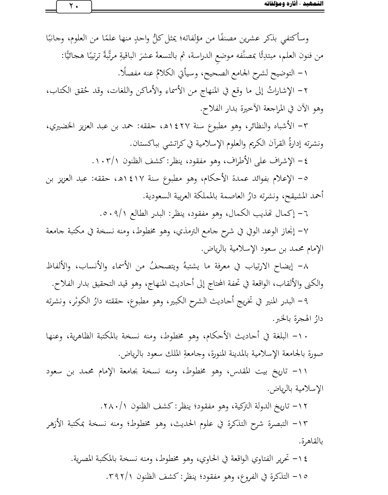 وسأكتفي بذكر عشرين مصنفًا من مؤلفاته؛ يمثل كلُّ واحدٍ منها علمًا من العلوم، وجانبًا من فنون العلم، مبتدِئًا بمصنَّفه موضعِ الدراسة، ثم بالتسعةَ عشرَ الباقيةِ مرتَّبةً ترتيبًا هجائيًّا: