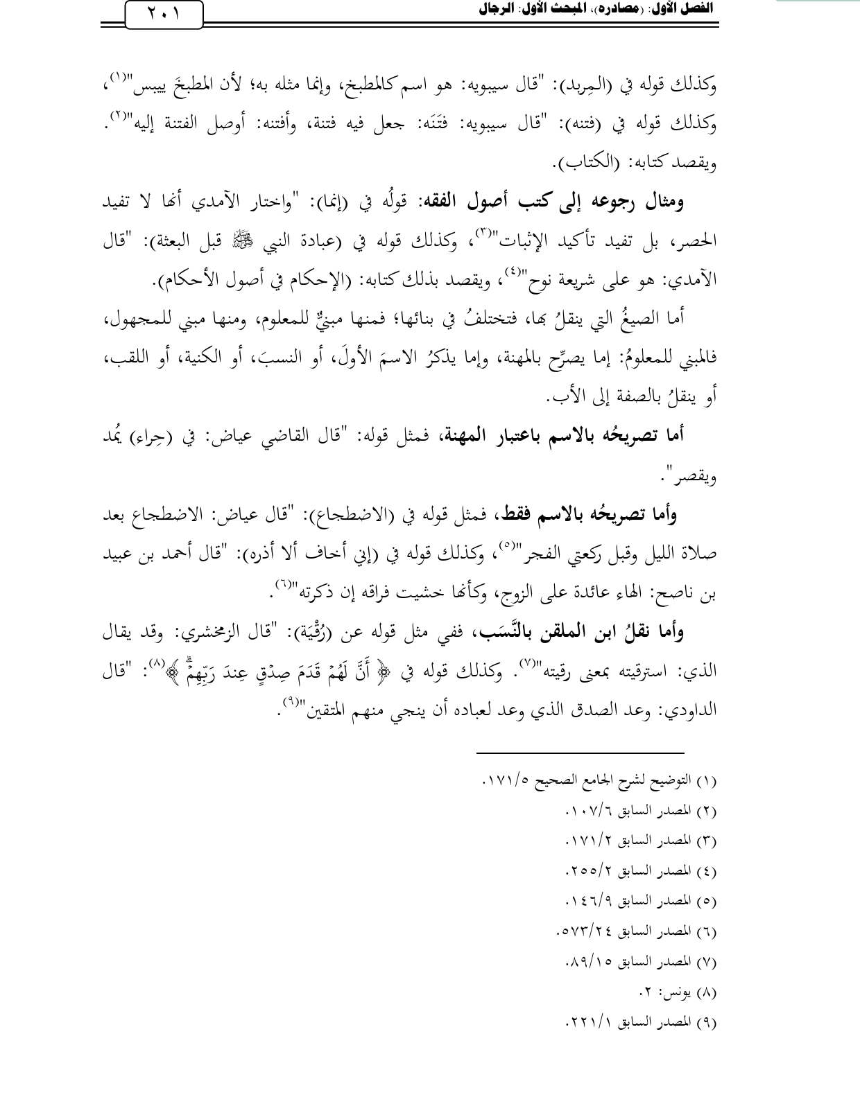 ومثال رجوعه إلى كتب أصول الفقه: قولُه في (إنما): "واختار الآمدي أنها لا تفيد الحصر، بل تفيد تأكيد الإثبات" (¬3)، وكذلك قوله في (عبادة النبي - صلى الله عليه وسلم - قبل البعثة): "قال الآمدي: هو على شريعة نوح" (¬4)، ويقصد بذلك كتابه: (الإحكام في أصول الأحكام).