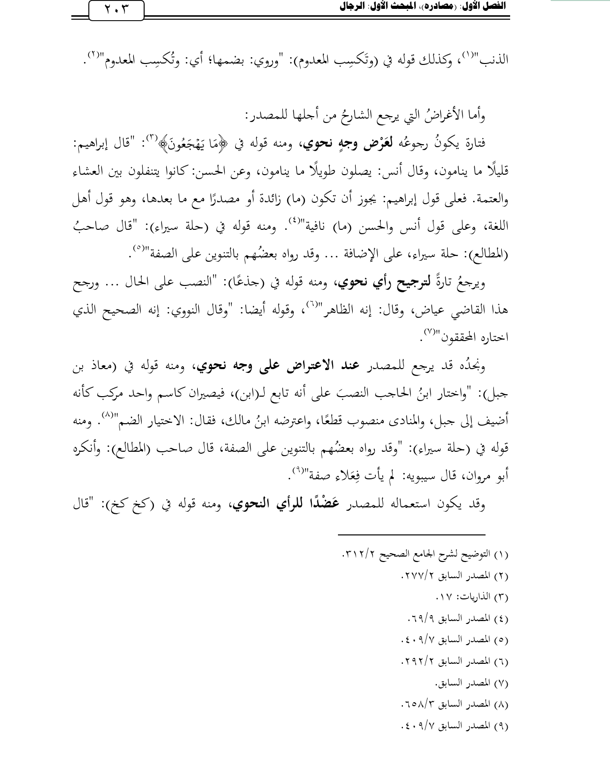 ونجدُه قد يرجع للمصدر عند الاعتراض على وجه نحوي، ومنه قوله في (معاذ بن جبل): "واختار ابنُ الحاجب النصبَ على أنه تابع لـ (ابن)، فيصيران كاسم واحد مركب كأنه أضيف إلى جبل، والمنادى منصوب قطعًا، واعترضه ابنُ مالك، فقال: الاختيار الضم" (¬8). ومنه قوله في (حلة سيراء): "وقد رواه بعضُهم بالتنوين على الصفة، قال صاحب (المطالع): وأنكره أبو مروان، قال سيبويه: لم يأت فِعَلاء صفة" (¬9).