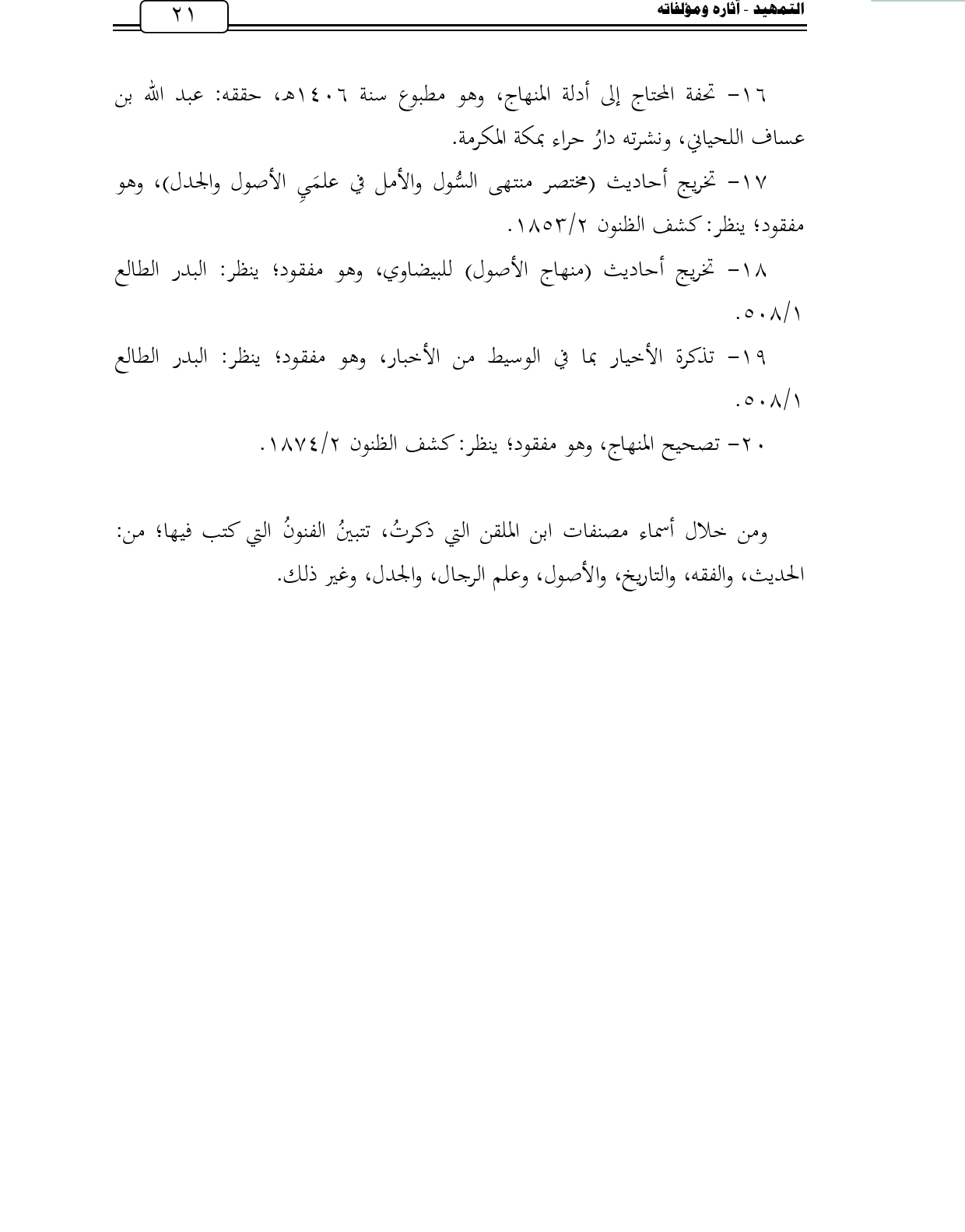 20 - تصحيح المنهاج، وهو مفقود؛ ينظر: كشف الظنون 2/ 1874.