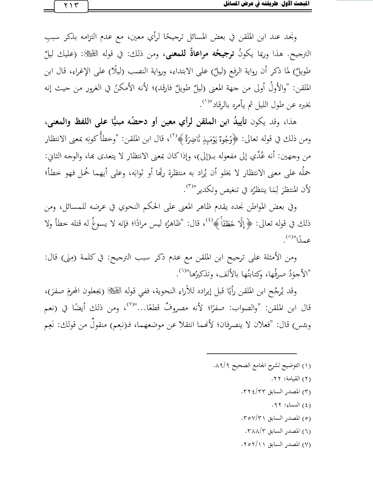 هذا، وقد يكون تأييدُ ابن الملقن لرأي معين أو دحضُه مبنيًّا على اللفظ والمعنى، ومن ذلك في قوله تعالى: {وُجُوهٌ يَوْمَئِذٍ نَّاضِرَةٌ} (¬2)، قال ابن الملقن: "وخطأُ كونِه بمعنى الانتظار من وجهين: أنه عُدِّي إلى مفعوله بـ (إلى)، وإذا كان بمعنى الانتظار لا يتعدى بها، والوجه الثاني: حملُه على معنى الانتظار لا يخلو أن يُراد به منتظرة ربَّها أو ثوابَه، وعلى أيهما حُمل فهو خطأ؛ لأن المنتظرَ لِمَا ينتظرُه في تنغيص وتكدير" (¬3).