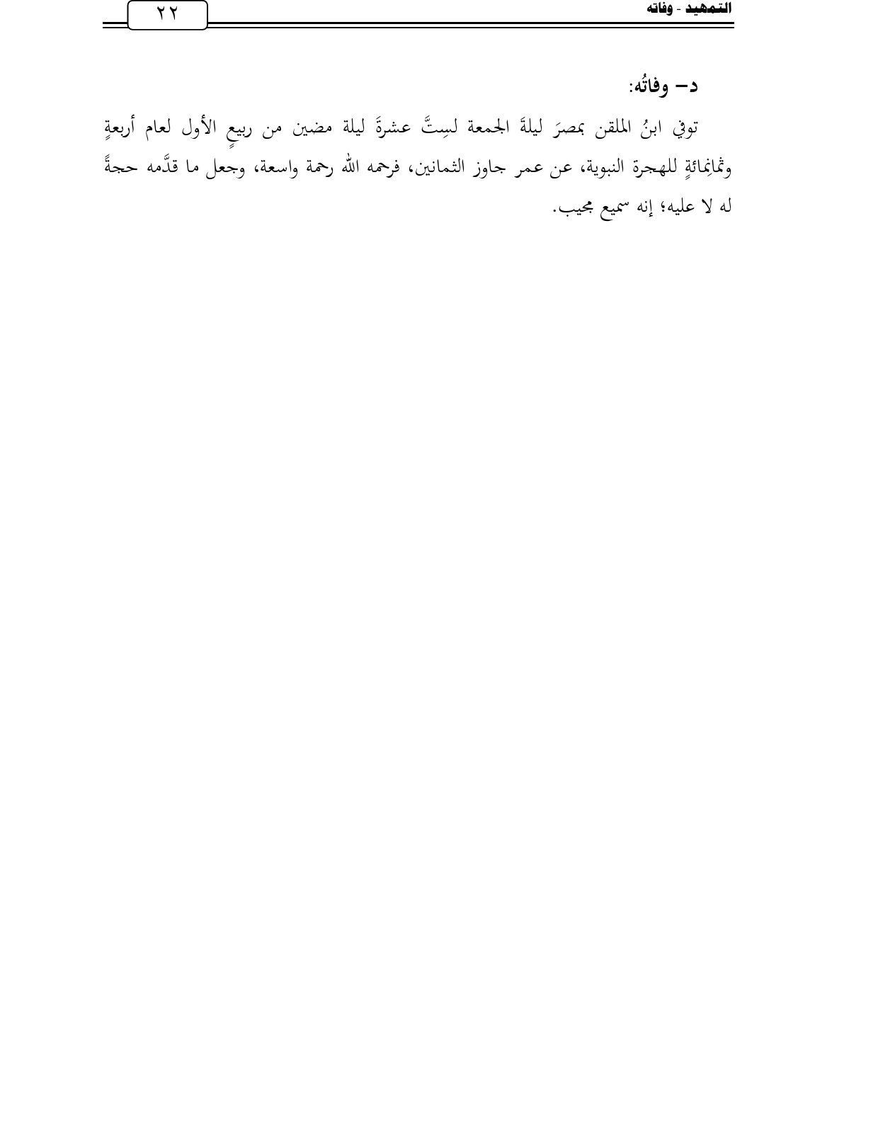 توفي ابنُ الملقن بمصرَ ليلةَ الجمعة لسِتَّ عشرةَ ليلة مضين من ربيعٍ الأول لعام أربعةٍ وثمانِمائةٍ للهجرة النبوية، عن عمر جاوز الثمانين، فرحمه الله رحمة واسعة، وجعل ما قدَّمه حجةً له لا عليه؛ إنه سميع مجيب.