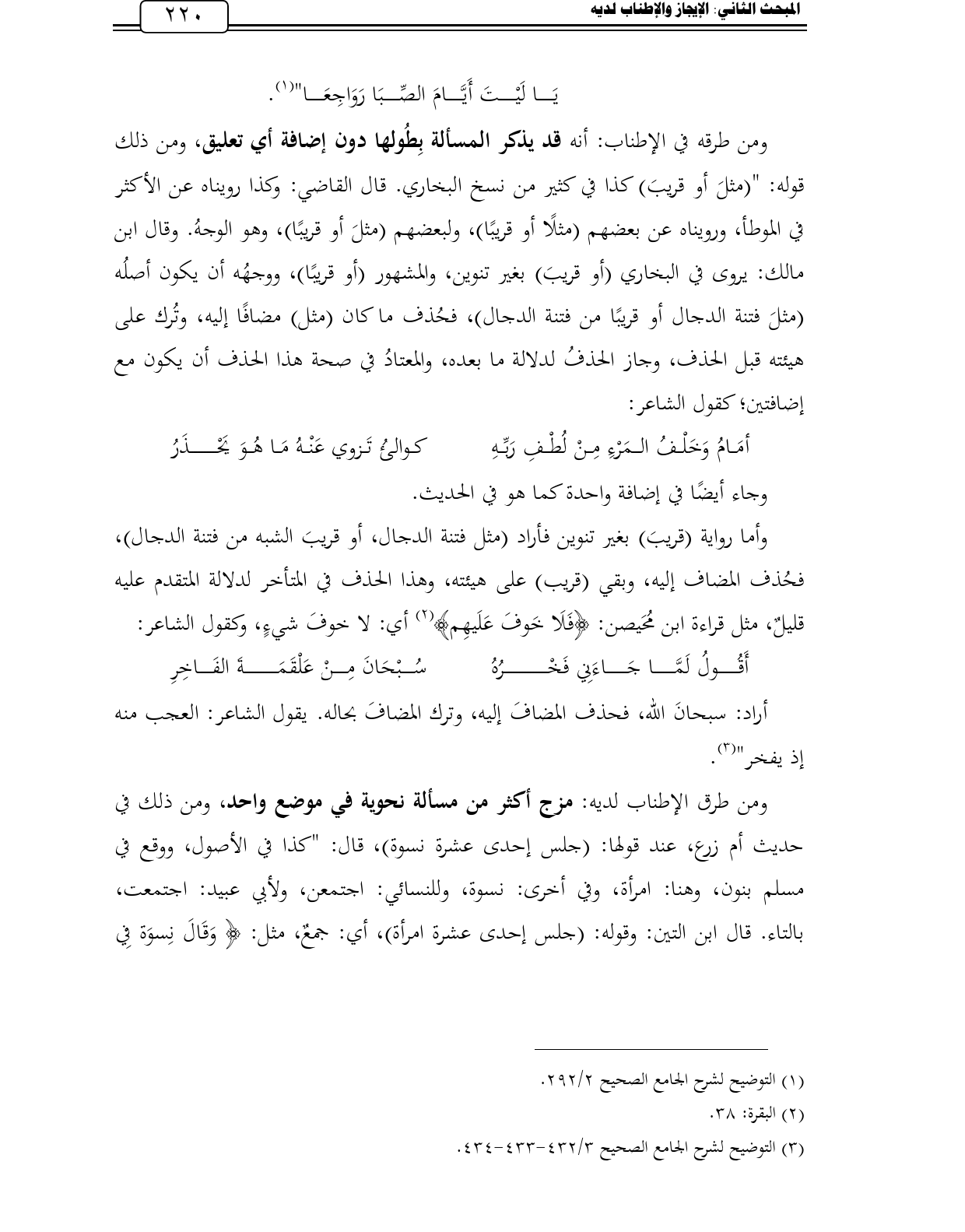 ومن طرقه في الإطناب: أنه قد يذكر المسألة بِطُولها دون إضافة أي تعليق، ومن ذلك قوله: " (مثلَ أو قريبَ) كذا في كثير من نسخ البخاري. قال القاضي: وكذا رويناه عن الأكثر في الموطأ، ورويناه عن بعضهم (مثلًا أو قريبًا)، ولبعضهم (مثلَ أو قريبًا)، وهو الوجهُ. وقال ابن مالك: يروى في البخاري (أو قريبَ) بغير تنوين، والمشهور (أو قريبًا)، ووجهُه أن يكون أصلُه (مثلَ فتنة الدجال أو قريبًا من فتنة الدجال)، فحُذف ما كان (مثل) مضافًا إليه، وتُرك على هيئته قبل الحذف، وجاز الحذفُ لدلالة ما بعده، والمعتادُ في صحة هذا الحذف أن يكون مع إضافتين؛ كقول الشاعر: