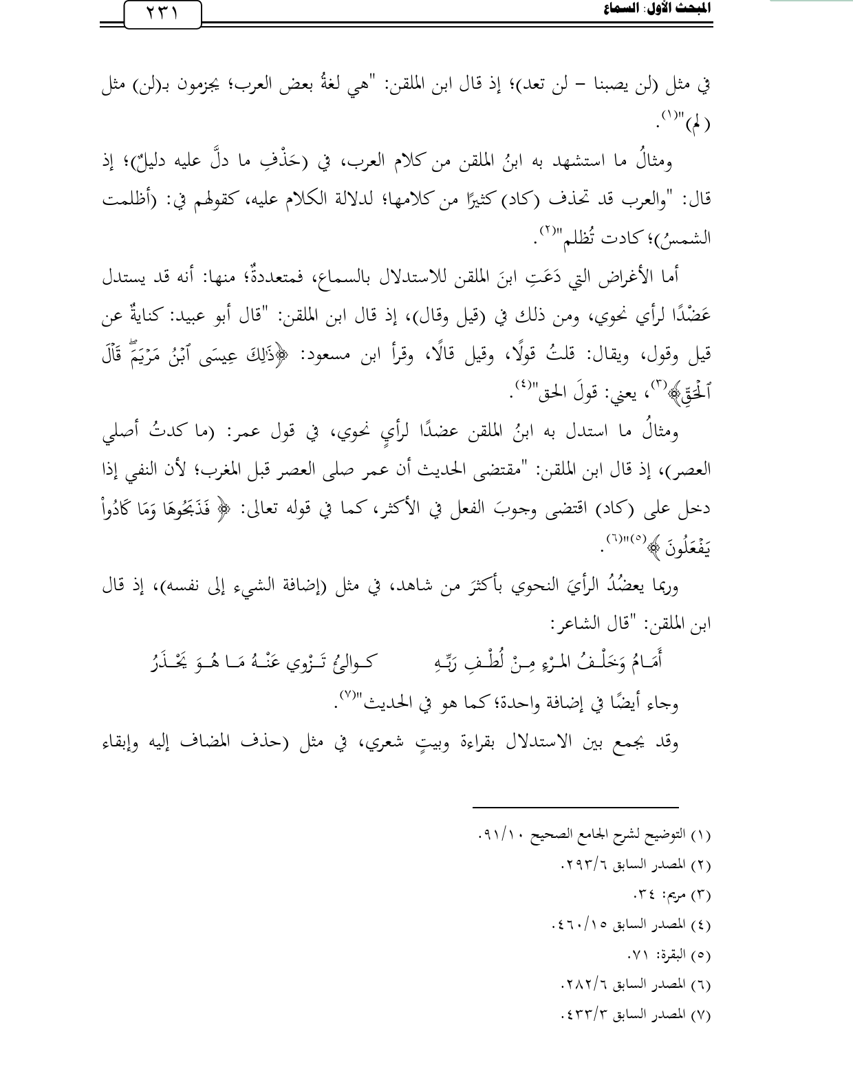 أما الأغراض التي دَعَتِ ابنَ الملقن للاستدلال بالسماع، فمتعددةٌ؛ منها: أنه قد يستدل عَضْدًا لرأي نحوي، ومن ذلك في (قيل وقال)، إذ قال ابن الملقن: "قال أبو عبيد: كنايةٌ عن قيل وقول، ويقال: قلتُ قولًا، وقيل قالًا، وقرأ ابن مسعود: {ذَلِكَ عِيسَى ابْنُ مَرْيَمَ قَالَ الْحَقِّ} (¬3)، يعني: قولَ الحق" (¬4).