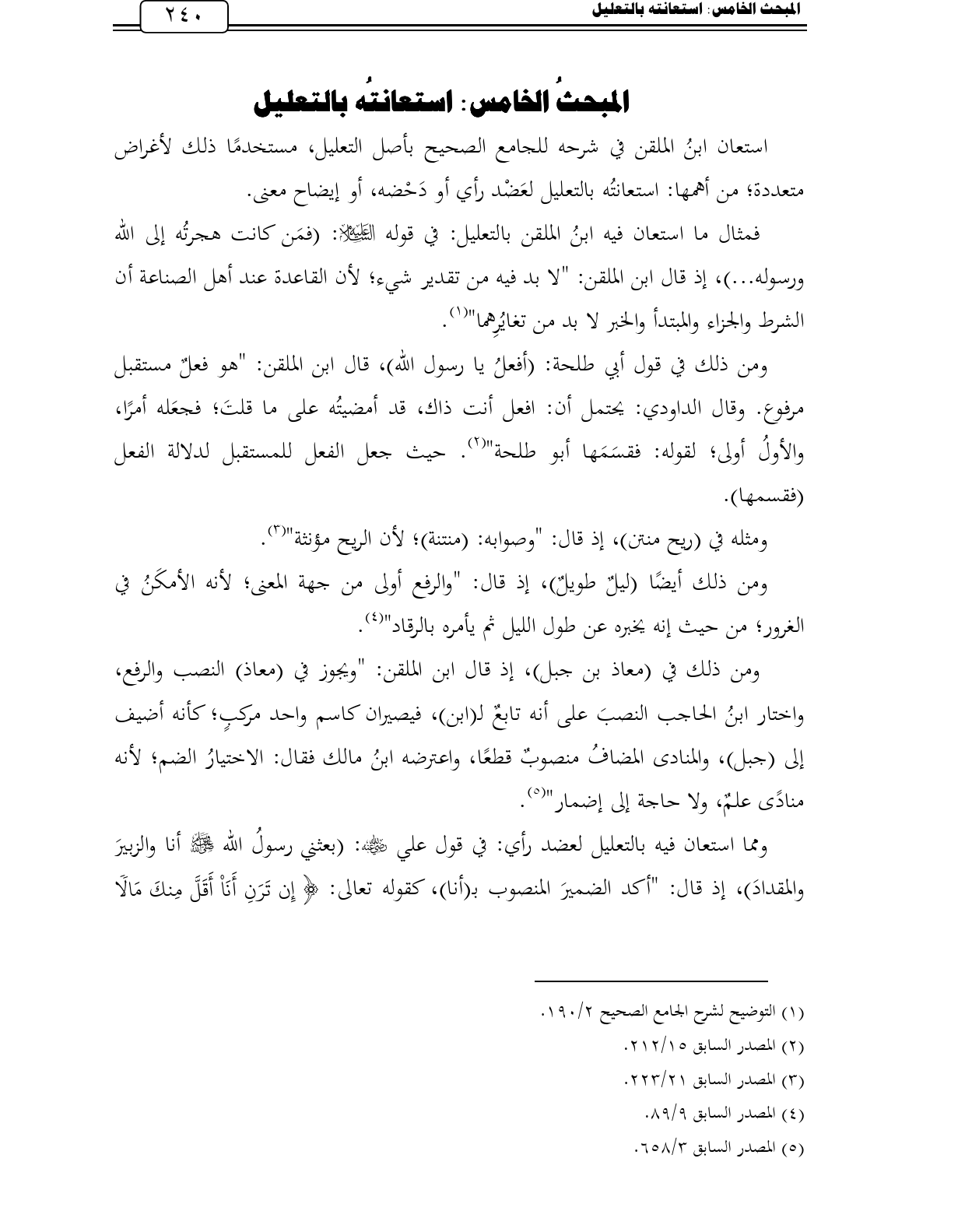 استعان ابنُ الملقن في شرحه للجامع الصحيح بأصل التعليل، مستخدمًا ذلك لأغراض متعددة؛ من أهمها: استعانتُه بالتعليل لعَضْد رأي أو دَحْضه، أو إيضاح معنى.
