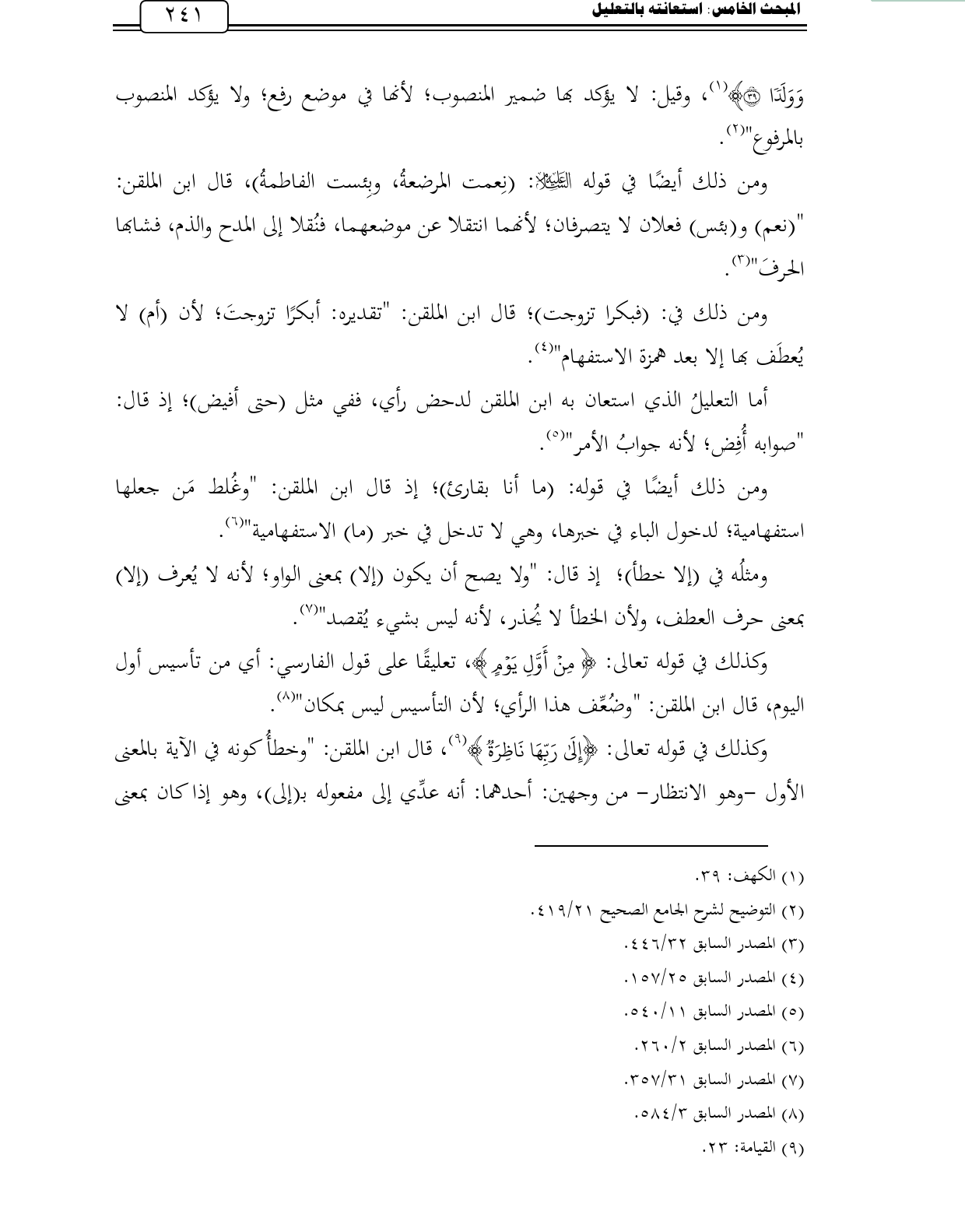 أما التعليلُ الذي استعان به ابن الملقن لدحض رأي، ففي مثل (حتى أفيض)؛ إذ قال: "صوابه أُفِض؛ لأنه جوابُ الأمر" (¬5).