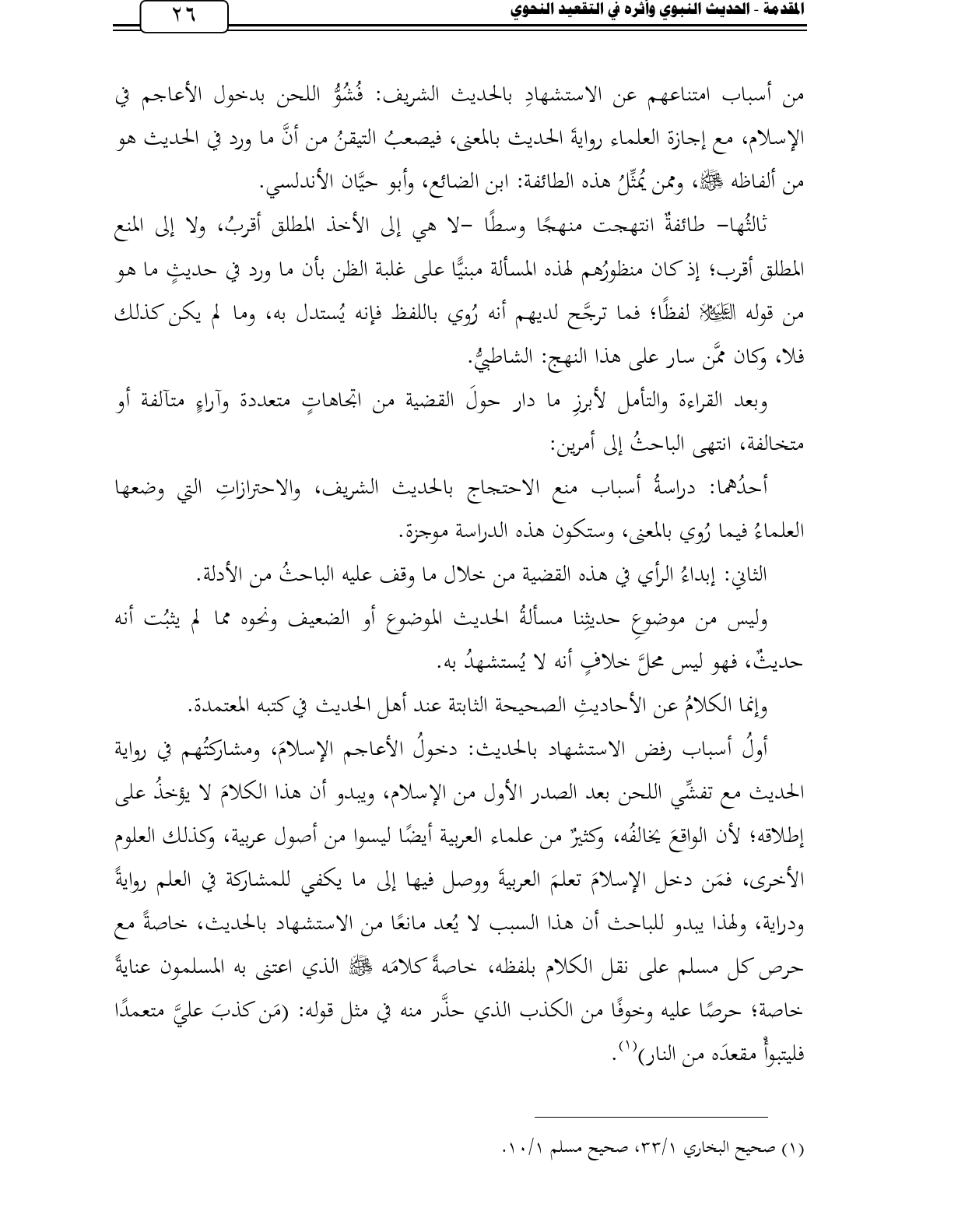 أولُ أسباب رفض الاستشهاد بالحديث: دخولُ الأعاجم الإسلامَ، ومشاركتُهم في رواية الحديث مع تفشِّي اللحن بعد الصدر الأول من الإسلام، ويبدو أن هذا الكلامَ لا يؤخذُ على إطلاقه؛ لأن الواقعَ يخالفُه، وكثيرٌ من علماء العربية أيضًا ليسوا من أصول عربية، وكذلك العلوم الأخرى، فمَن دخل الإسلامَ تعلمَ العربيةَ ووصل فيها إلى ما يكفي للمشاركة في العلم روايةً ودراية، ولهذا يبدو للباحث أن هذا السبب لا يُعد مانعًا من الاستشهاد بالحديث، خاصةً مع حرص كل مسلم على نقل الكلام بلفظه، خاصةً كلامَه - صلى الله عليه وسلم - الذي اعتنى به المسلمون عنايةً خاصة؛ حرصًا عليه وخوفًا من الكذب الذي حذَّر منه في مثل قوله: (مَن كذبَ عليَّ متعمدًا فليتبوأْ مقعدَه من النار) (¬1).