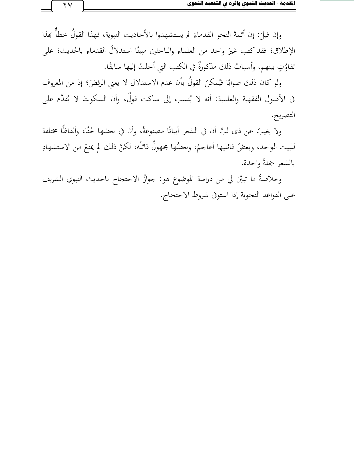 وخلاصةُ ما تبيَّن لي من دراسة الموضوع هو: جوازُ الاحتجاج بالحديث النبوي الشريف على القواعد النحوية إذا استوفى شروط الاحتجاج.