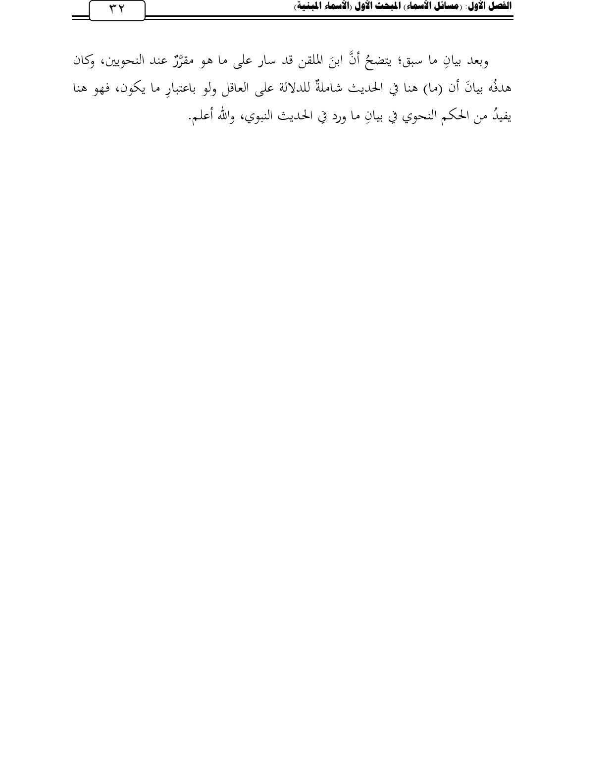 وبعد بيانِ ما سبق؛ يتضحُ أنَّ ابنَ الملقن قد سار على ما هو مقرَّرٌ عند النحويين، وكان هدفُه بيانَ أن (ما) هنا في الحديث شاملةٌ للدلالة على العاقل ولو باعتبارِ ما يكون، فهو هنا يفيدُ من الحكم النحوي في بيانِ ما ورد في الحديث النبوي، والله أعلم.