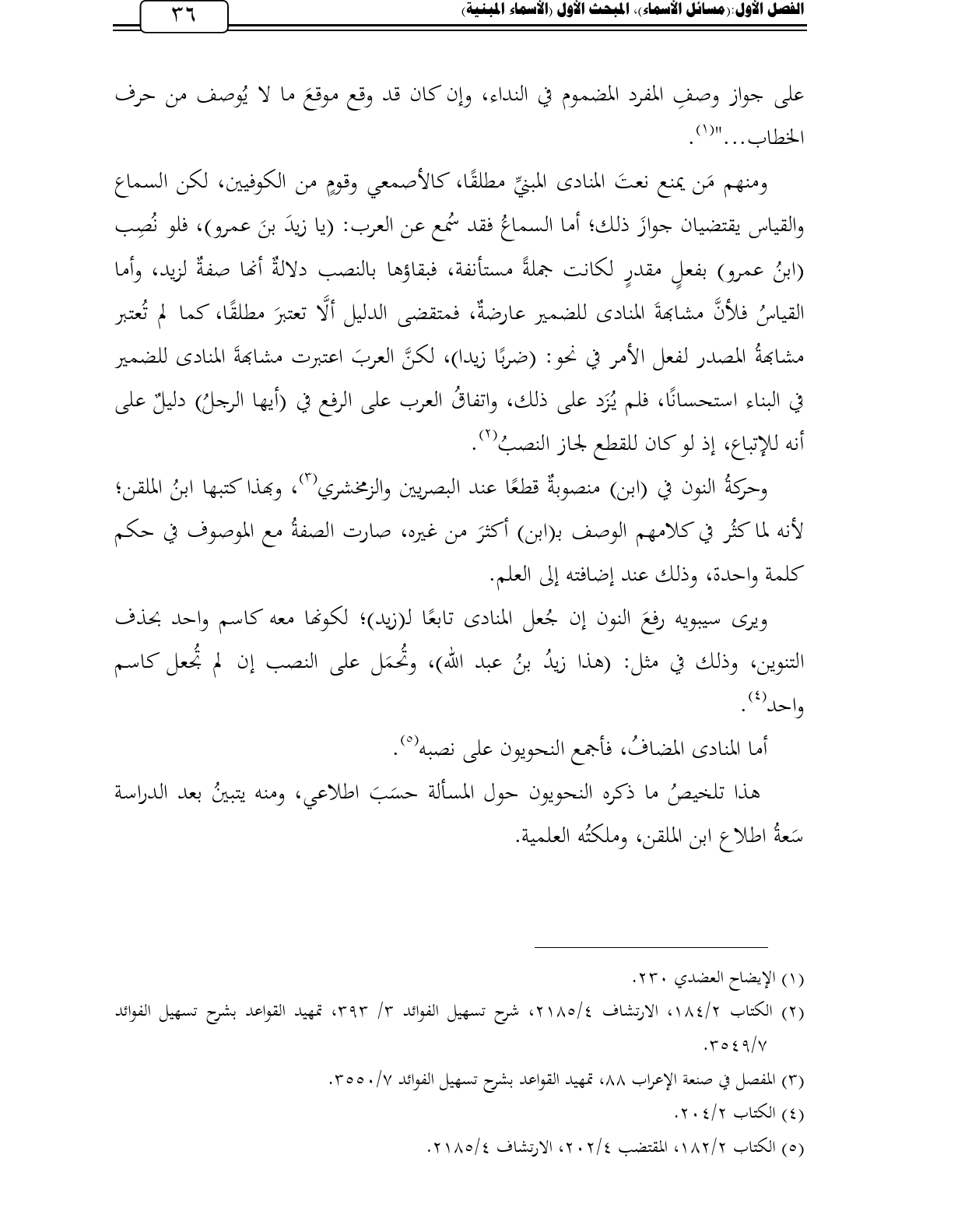 ومنهم مَن يمنع نعتَ المنادى المبنيِّ مطلقًا، كالأصمعي وقومٍ من الكوفيين، لكن السماع والقياس يقتضيان جوازَ ذلك؛ أما السماعُ فقد سُمع عن العرب: (يا زيدَ بنَ عمرو)، فلو نُصِب (ابنُ عمرو) بفعلٍ مقدرٍ لكانت جملةً مستأنفة، فبقاؤها بالنصب دلالةٌ أنها صفةٌ لزيد، وأما القياسُ فلأنَّ مشابهةَ المنادى للضمير عارضةٌ، فمتقضى الدليل ألَّا تعتبرَ مطلقًا، كما لم تُعتبر مشابهةُ المصدر لفعل الأمر في نحو: (ضربًا زيدا)، لكنَّ العربَ اعتبرت مشابهةَ المنادى للضمير في البناء استحسانًا، فلم يُزَد على ذلك، واتفاقُ العرب على الرفع في (أيها الرجلُ) دليلٌ على أنه للإتباع، إذ لو كان للقطع لجاز النصبُ (¬2).