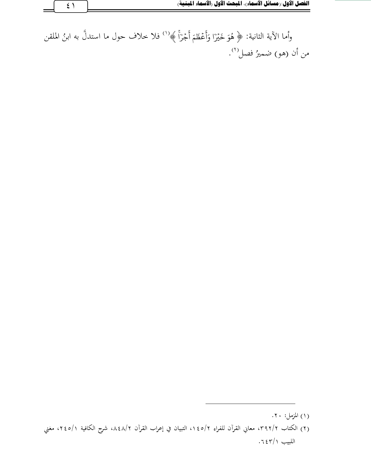 وأما الآية الثانية: {هُوَ خَيْرًا وَأَعْظَمَ أَجْرًا} (¬1) فلا خلاف حول ما استدلَّ به ابنُ الملقن من أن (هو) ضميرُ فصل (¬2).