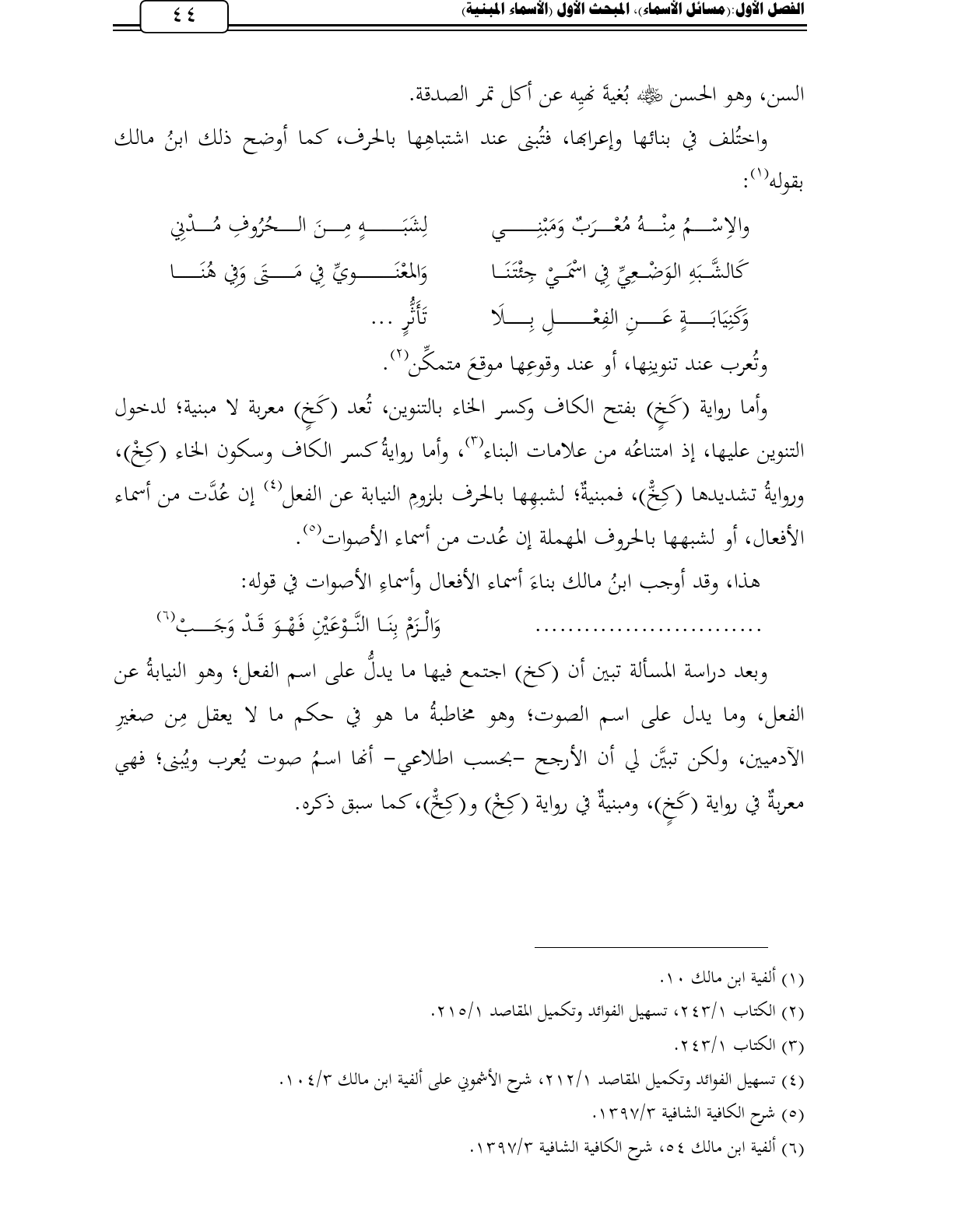 وأما رواية (كَخٍ) بفتح الكاف وكسر الخاء بالتنوين، تُعد (كَخٍ) معربة لا مبنية؛ لدخول التنوين عليها، إذ امتناعُه من علامات البناء (¬3)، وأما روايةُ كسر الكاف وسكون الخاء (كِخْ)، وروايةُ تشديدها (كِخّْ)، فمبنيةٌ؛ لشبهِها بالحرف بلزومِ النيابة عن الفعل (¬4) إن عُدَّت من أسماء الأفعال، أو لشبهها بالحروف المهملة إن عُدت من أسماء الأصوات (¬5).