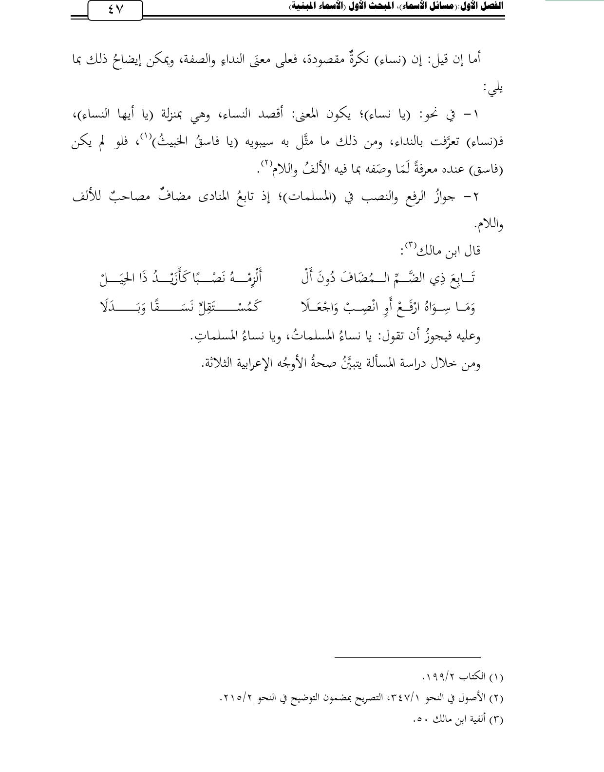 2 - جوازُ الرفع والنصب في (المسلمات)؛ إذ تابعُ المنادى مضافٌ مصاحبٌ للألف واللام.