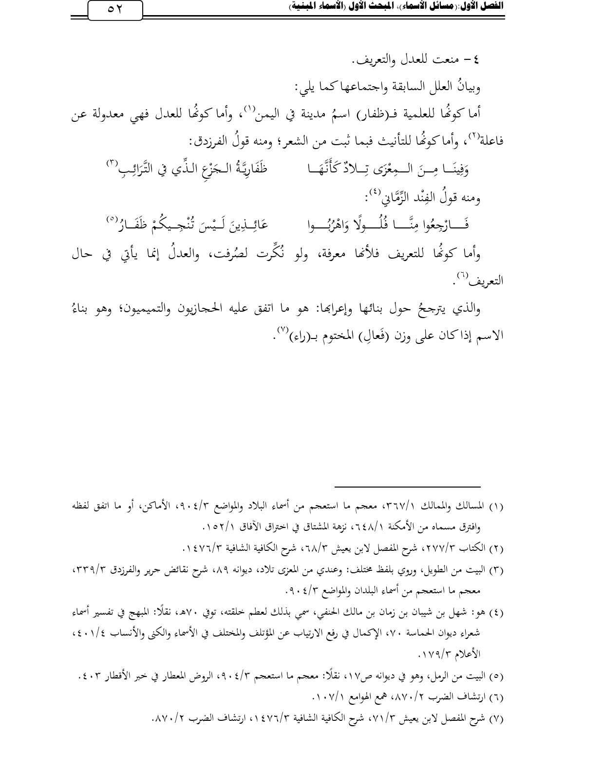 أما كونُها للعلمية فـ (ظفار) اسمُ مدينة في اليمن (¬1)، وأما كونُها للعدل فهي معدولة عن فاعلة (¬2)، وأما كونُها للتأنيث فبما ثبت من الشعر؛ ومنه قولُ الفرزدق:
