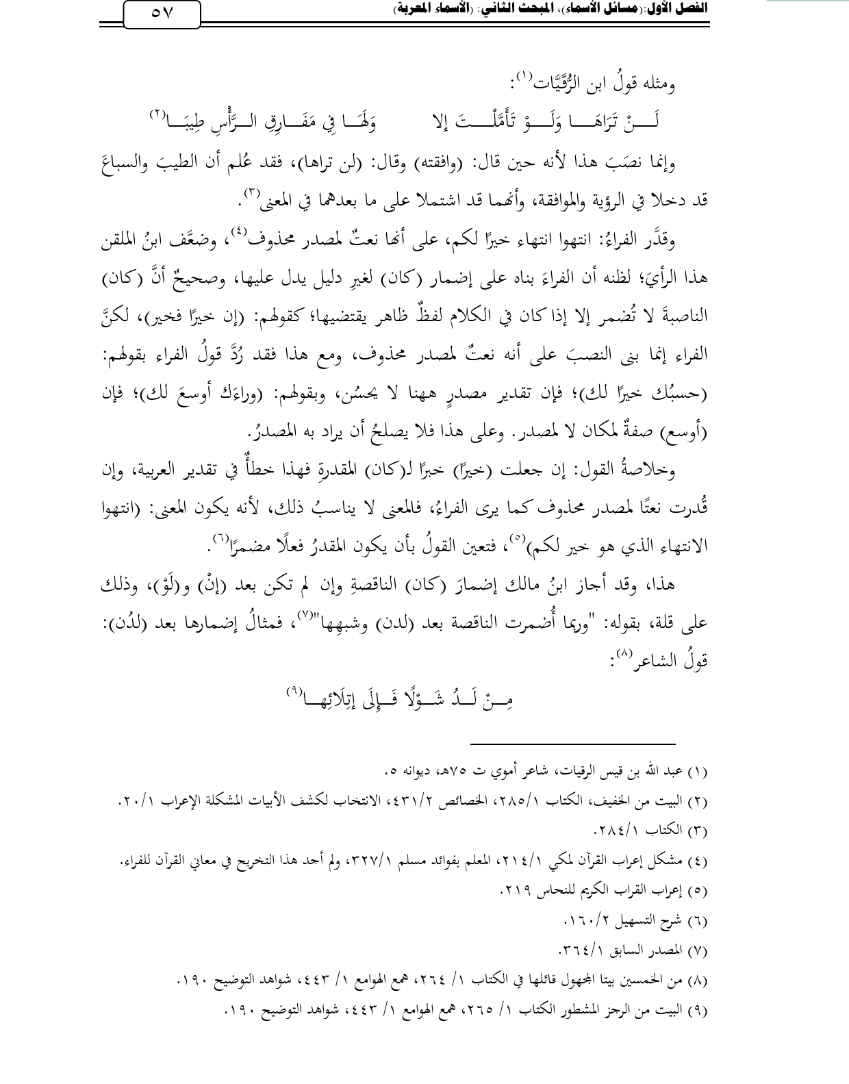 وقدَّر الفراءُ: انتهوا انتهاء خيرًا لكم، على أنها نعتٌ لمصدر محذوف (¬4)، وضعَّف ابنُ الملقن هذا الرأيَ؛ لظنه أن الفراءَ بناه على إضمار (كان) لغيرِ دليل يدل عليها، وصحيحٌ أنَّ (كان) الناصبةَ لا تُضمر إلا إذا كان في الكلام لفظٌ ظاهر يقتضيها؛ كقولهم: (إن خيرًا فخير)، لكنَّ الفراء إنما بنى النصبَ على أنه نعتٌ لمصدر محذوف، ومع هذا فقد رُدَّ قولُ الفراء بقولهم: (حسبُك خيرًا لك)؛ فإن تقدير مصدرٍ ههنا لا يحسُن، وبقولهم: (وراءَك أوسعَ لك)؛ فإن (أوسع) صفةٌ لمكان لا لمصدر. وعلى هذا فلا يصلحُ أن يراد به المصدرُ.