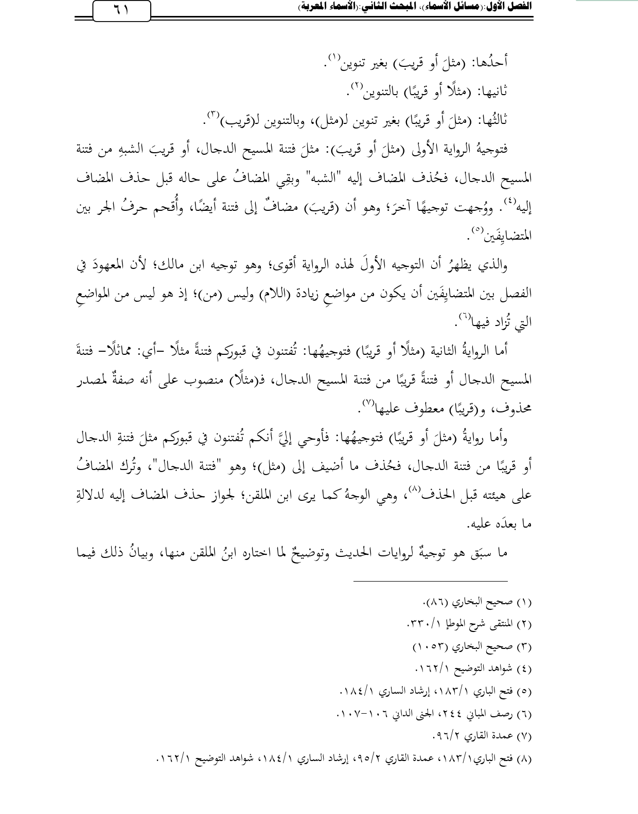 فتوجيهُ الرواية الأولى (مثلَ أو قريبَ): مثلَ فتنة المسيح الدجال، أو قريبَ الشبهِ من فتنة المسيح الدجال، فحُذف المضاف إليه "الشبه" وبقِي المضافُ على حاله قبل حذف المضاف إليه (¬4). ووُجهت توجيهًا آخرَ؛ وهو أن (قريبَ) مضافٌ إلى فتنة أيضًا، وأُقحم حرفُ الجر بين المتضايِفَين (¬5).