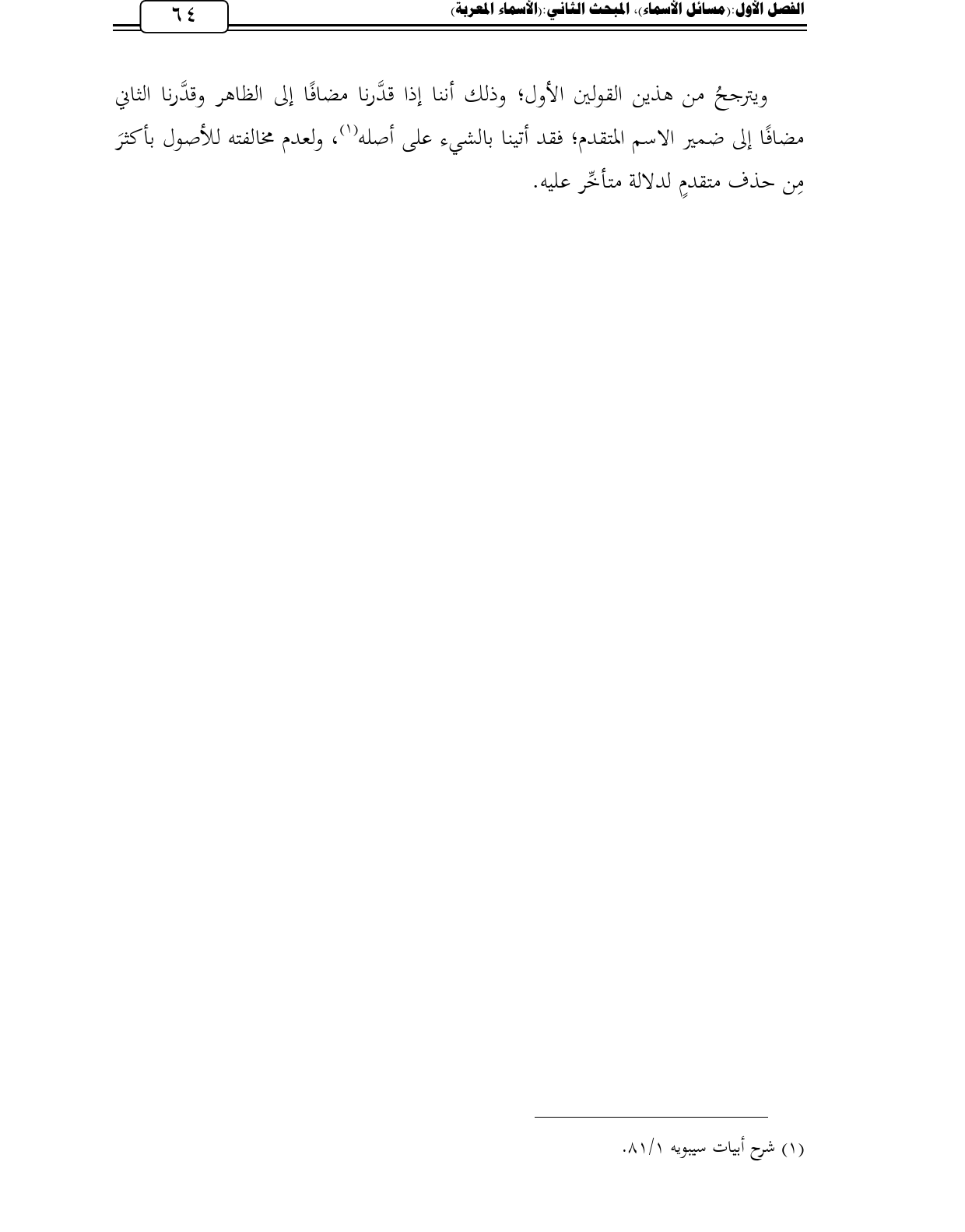 ويترجحُ من هذين القولين الأول؛ وذلك أننا إذا قدَّرنا مضافًا إلى الظاهر وقدَّرنا الثاني مضافًا إلى ضمير الاسم المتقدم؛ فقد أتينا بالشيء على أصله (¬1)، ولعدم مخالفته للأصول بأكثرَ مِن حذف متقدمٍ لدلالة متأخِّر عليه.