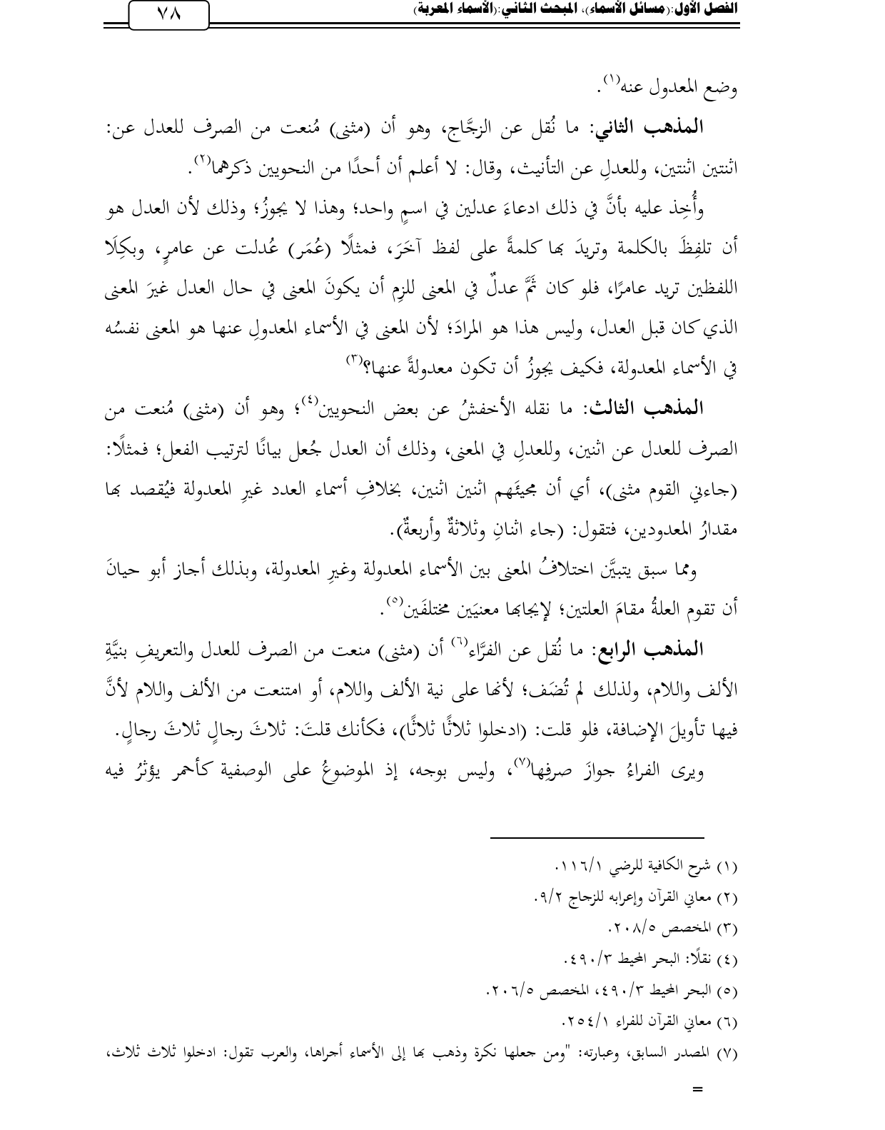 المذهب الثاني: ما نُقل عن الزجَّاج، وهو أن (مثنى) مُنعت من الصرف للعدل عن: اثنتين اثنتين، وللعدلِ عن التأنيث، وقال: لا أعلم أن أحدًا من النحويين ذكرهما (¬2).