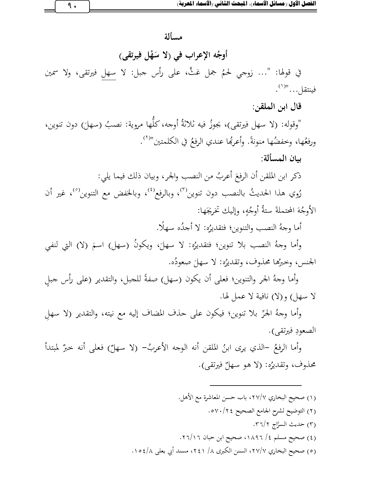 وأما الرفعُ -الذي يرى ابنُ الملقن أنه الوجه الأعربُ- (لا سهلٌ) فعلى أنه خبرٌ لمبتدأ محذوف، وتقديرُه: (لا هو سهلٌ فيرتقى).