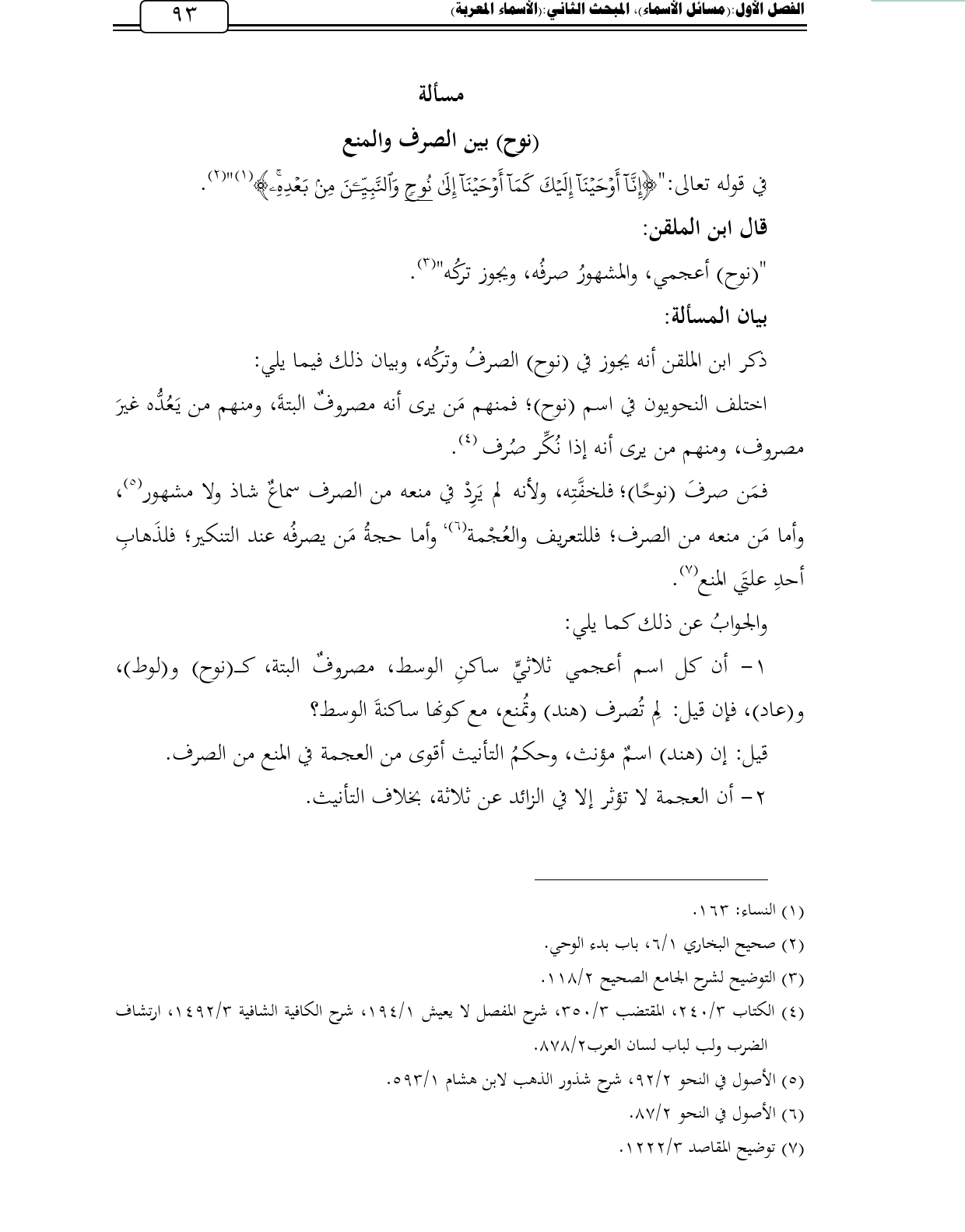 فمَن صرفَ (نوحًا)؛ فلخفَّتِه، ولأنه لم يَرِدْ في منعه من الصرف سماعٌ شاذ ولا مشهور (¬5)، وأما مَن منعه من الصرف؛ فللتعريف والعُجْمة (¬6)، وأما حجةُ مَن يصرفُه عند التنكير؛ فلذَهابِ أحدِ علتَي المنع (¬7).
