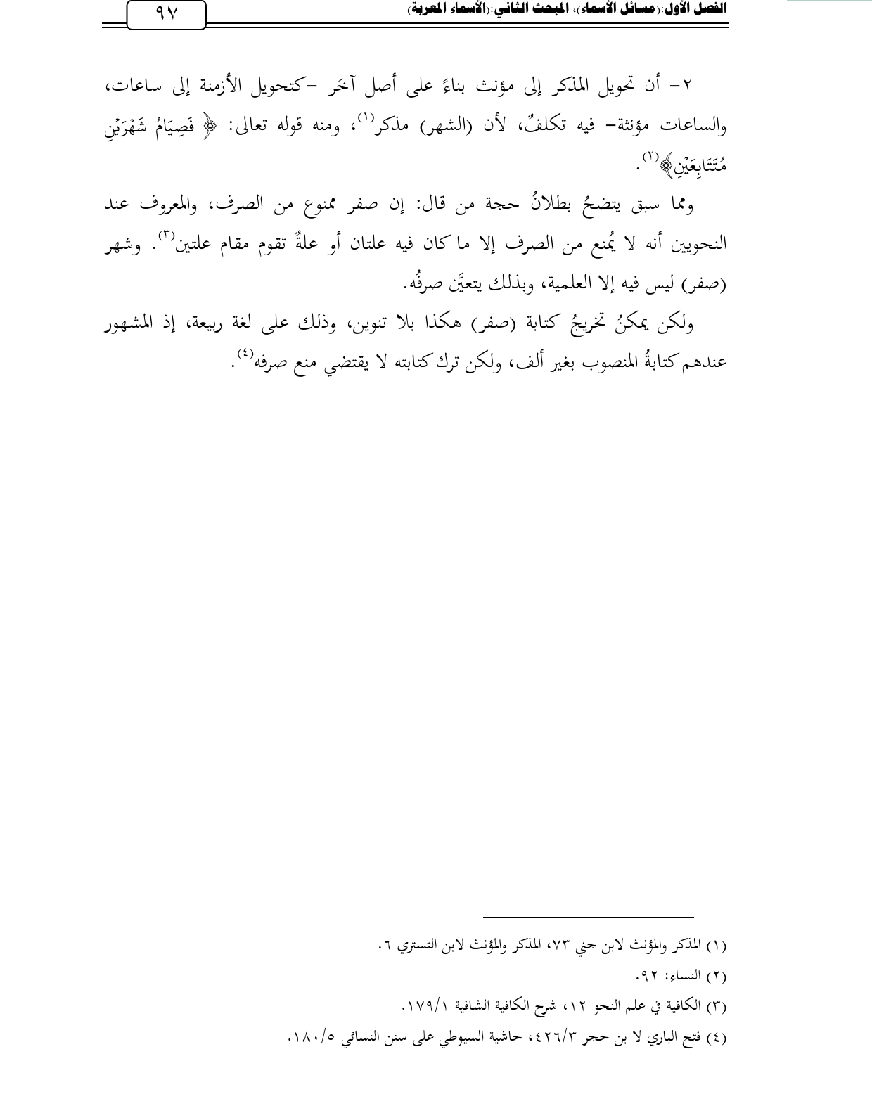 ومما سبق يتضحُ بطلانُ حجة من قال: إن صفر ممنوع من الصرف، والمعروف عند النحويين أنه لا يُمنع من الصرف إلا ما كان فيه علتان أو علةٌ تقوم مقام علتين (¬3). وشهر (صفر) ليس فيه إلا العلمية، وبذلك يتعيَّن صرفُه.