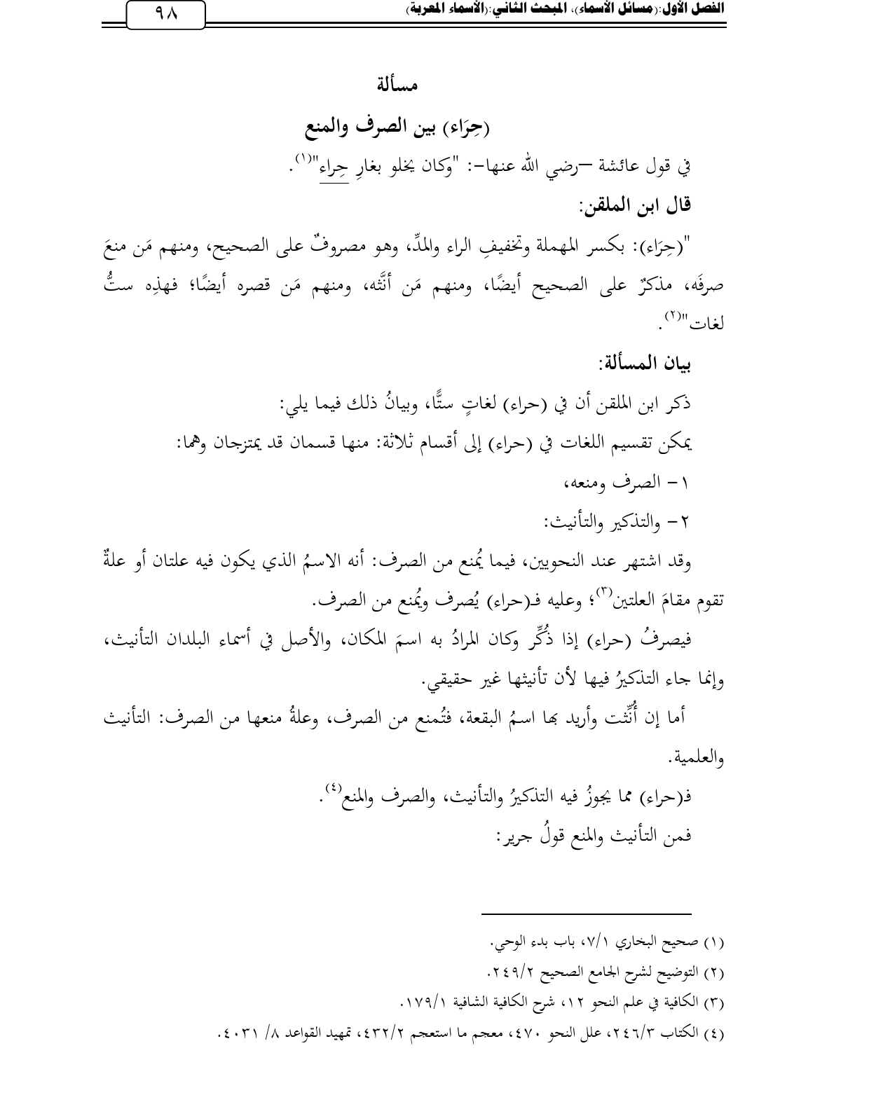 وقد اشتهر عند النحويين، فيما يُمنع من الصرف: أنه الاسمُ الذي يكون فيه علتان أو علةٌ تقوم مقامَ العلتين (¬3)؛ وعليه فـ (حراء) يُصرف ويُمنع من الصرف.