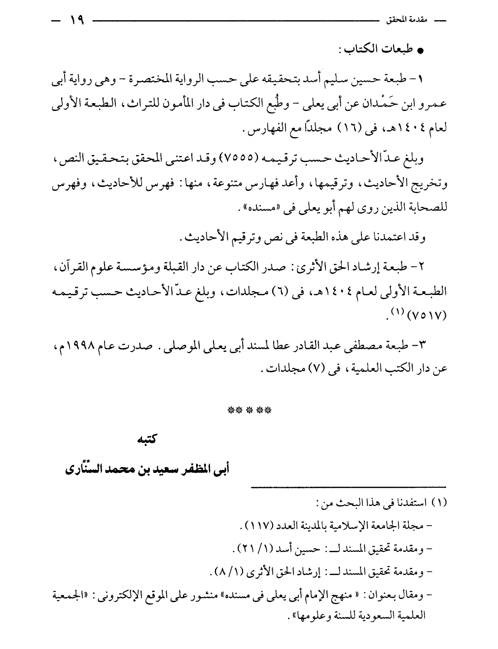 ٣ - طبعة مصطفى عبد القادر عطا لمسند أبي يعلى الموصلي. صدرت عام ١٩٩٨ م، عن دار الكتب العلمية، في (٧) مجلدات.