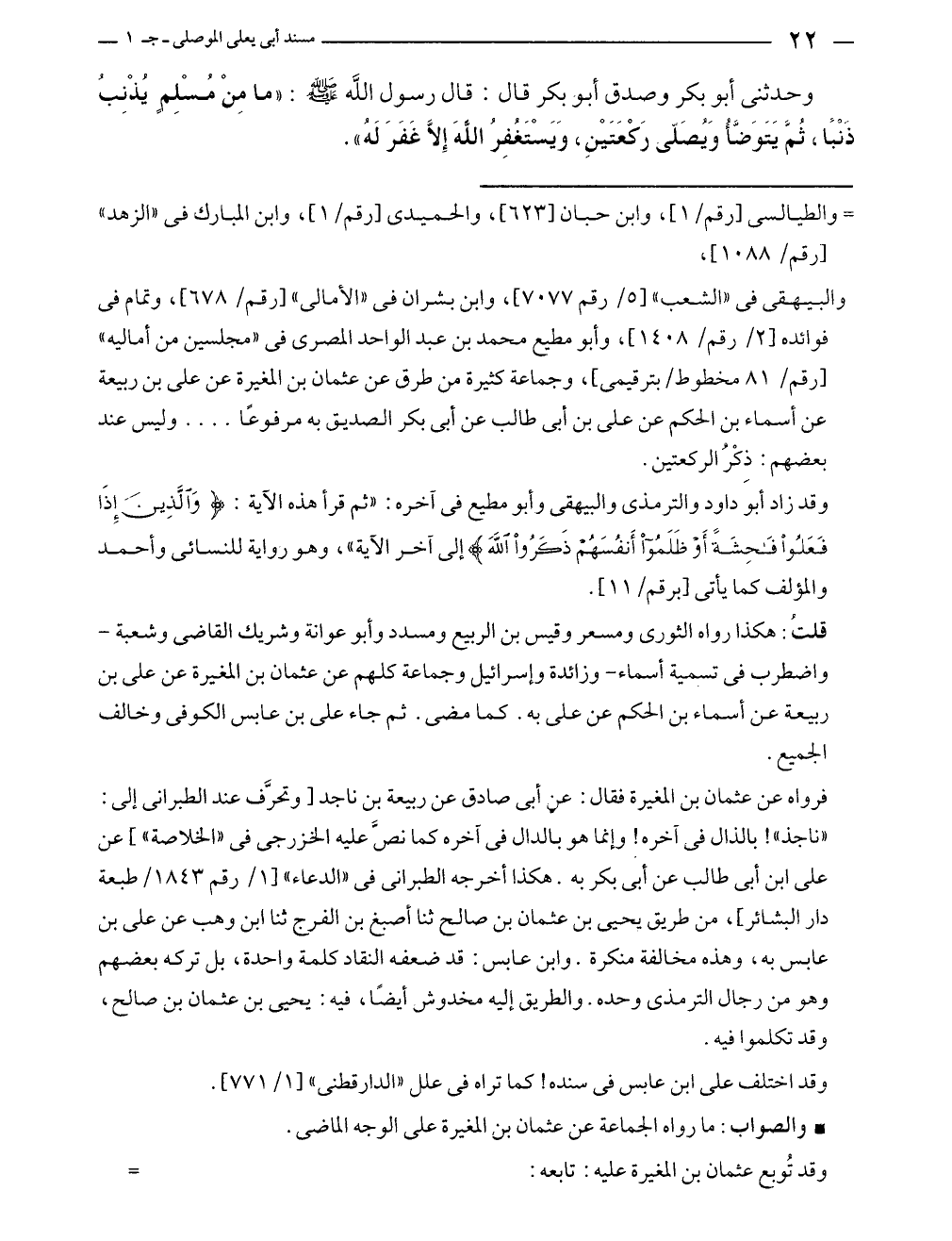 وحدثنى أبو بكر وصدق أبو بكر قال: قال رسول الله - صلى الله عليه وسلم -: "ما مِنْ مُسْلِمٍ يُذْنِبُ ذَنْبًا، ثُمَّ يَتَوَضَّأُ وَيصَلِّي رَكْعَتَيْنِ، وَيَسْتَغْفِرُ اللهَ إِلَّا غَفَرَ لَهُ".