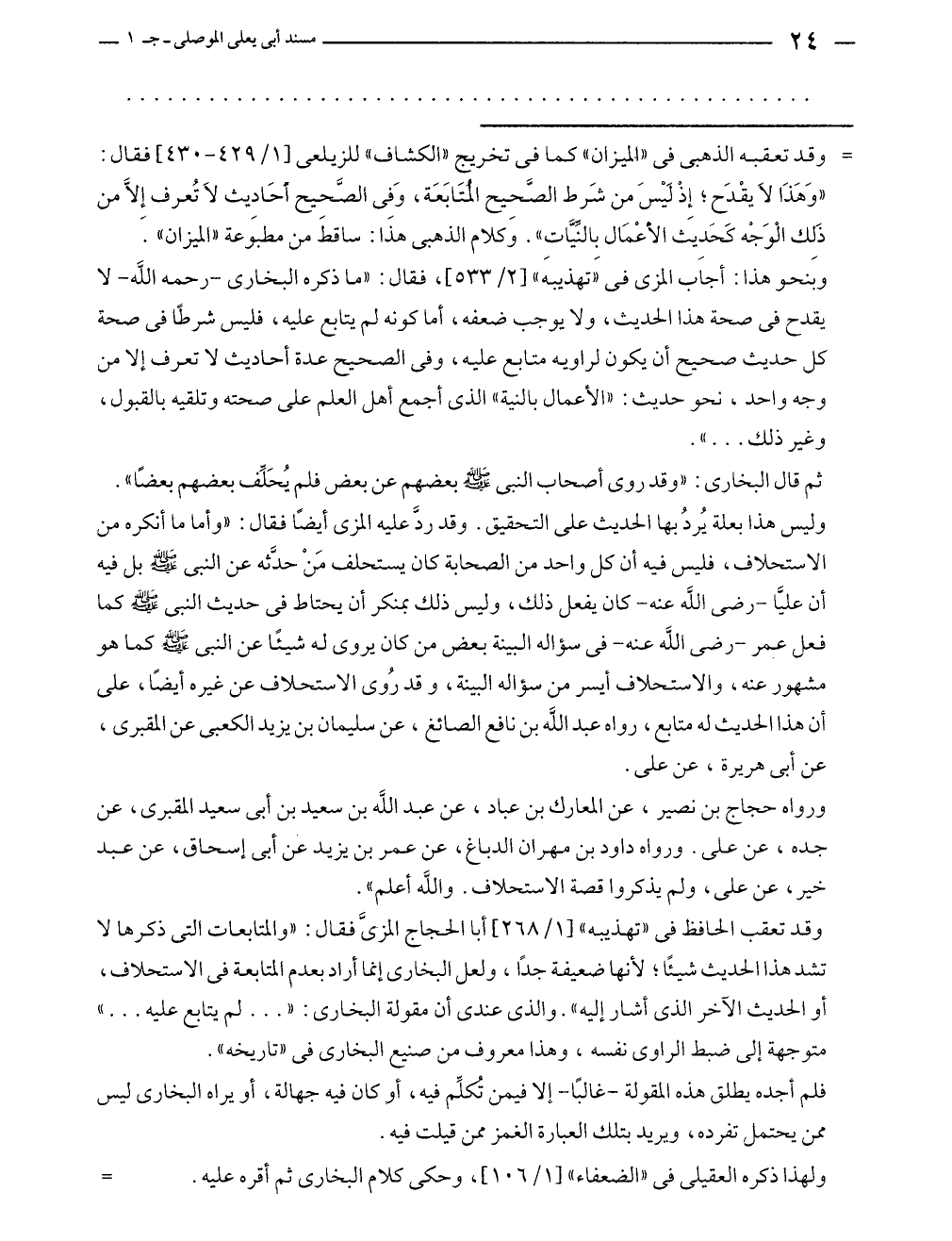وقد تعقب الحافظ في "تهذيبه" [١/ ٢٦٨] أبا الحجاج المزيَّ فقال: "والمتابعات التى ذكرها لا تشد هذا الحديث شيئًا؛ لأنها ضعيفة جدًّا، ولعل البخاري إنما أراد بعدم المتابعة في الاستحلاف، أو الحديث الآخر الذي أشار إليه". والذى عندى أن مقولة البخاري: " ... لم يتابع عليه ... " متوجهة إلى ضبط الراوى نفسه، وهذا معروف من صنيع البخاري في "تاريخه".