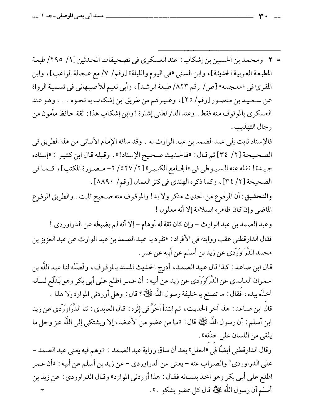 وقال الدارقطني أيضًا في "العلل" بعد أن ساق رواية عبد الصمد: "وهم فيه يعنى عبد الصمد - على الدراوردي! والصواب عنه - يعنى عن الدراوردي - عن زيد بن أسلم عن أبيه: "أن عمر اطلع على أبي بكر وهو آخذ بلسانه فقال: هذا أوردني الموارد" وقال الدراوردي: عن زيد بن أسلم أن رسول الله - صلى الله عليه وسلم - قال كل عضو يشكو.". =