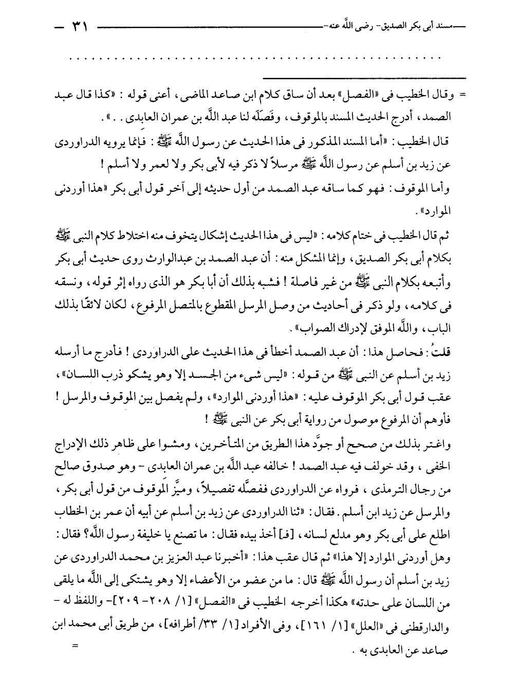 قلتُ: فحاصل هذا: أن عبد الصمد أخطأ في هذا الحديث على الدراوردي! فأدرج ما أرسله زيد بن أسلم عن النبي - صلى الله عليه وسلم - من قوله: "ليس شئ من الجسد إلا وهو يشكو ذرب اللسان"، عقب قول أبي بكر الموقوف عليه: "هذا أوردني الموارد"، ولم يفصل بين الموقوف والمرسل! فأوهم أن المرفوع موصول من رواية أبي بكر عن النبي - صلى الله عليه وسلم -!