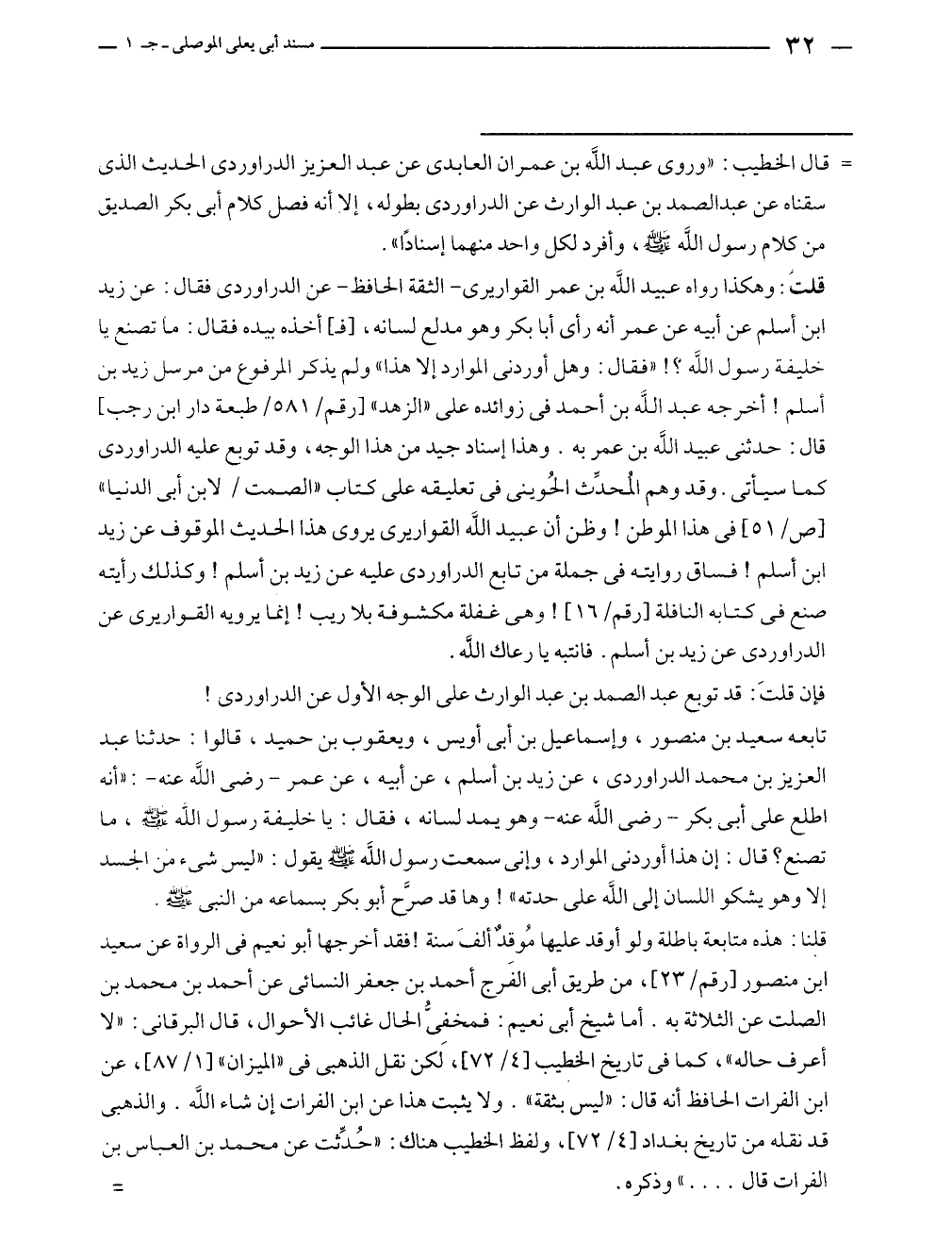 قلتَ: وهكذا رواه عبيد الله بن عمر القواريري - الثقة الحافظ - عن الدراوردى فقال: عن زيد بن أسلم عن أبيه عن عمر أنه رأى أبا بكر وهو مدلع لسانه، [فـ] أخذه يده فقال: ما تصنع يا خليفة رسول الله؟! "فقال: وهل أوردني الوارد إلا هذا" ولم يذكر المرفوع من مرسل زيد بن أسلم! أخرجه عبد اللَّه بن أحمد في زوائده على "الزهد" [رقم/ ٥٨١/ طبعة دار ابن رجب] قال: حدثنى عبيد الله بن عمر به. وهذا إسناد جيد من هذا الوجه، وقد توبع عليه الدراوردي كما سيأتي. وقد وهم المُحدِّث الحُويني في تعليقه على كتاب "الصمت/ لابن أبي الدنيا" [ص/ ٥١] في هذا الموطن! وظن أن عبيد الله القواريري يروى مذا الحديث الوقوف عن زيد بن أسلم! فساق روايته في جملة من تابع الدراوردي عليه عن زيد بن أسلم! وكذلك رأيته صنع في كتابه النافلة [رقم/ ١٦]! وهى غفلة مكشوفة بلا ريب! إنما يرويه القواريري عن الدراوردي عن زيد بن أسلم. فانتبه يا رعاك الله.