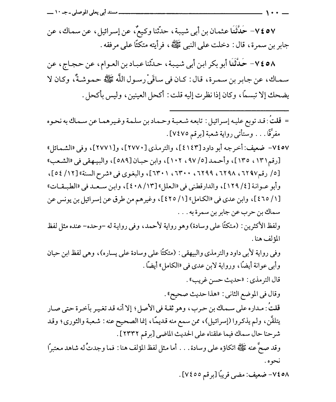 ٧٤٥٧ - حَدَّثَنَا عثمان بن أبي شيبة، حدّثنا وكيع، عن إسرائيل، عن سماك، عن جابر بن سمرة، قال: دخلت على النبي - صلى الله عليه وسلم -، فرأيته متكئًا على مرفقه.