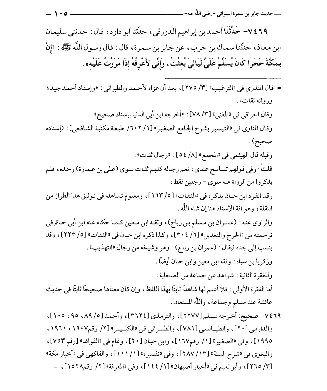 ٧٤٦٩ - حَدَّثَنَا أحمد بن إبراهيم الدورقي، حدّثنا أبو داود، قال: حدثني سليمان بن معاذ، حدّثنا سماك بن حرب، عن جابر بن سمرة، قال: قال رسول الله - صلى الله عليه وسلم -: "إِنَّ بِمَكَّةَ حَجَرًا كانَ يُسَلِّمُ عَلَيَّ لَيَالِىَ بُعِثْتُ، وَإِنِّى لأَعْرِفه إذَا مَرَرْتُ عَلَيْهِ".