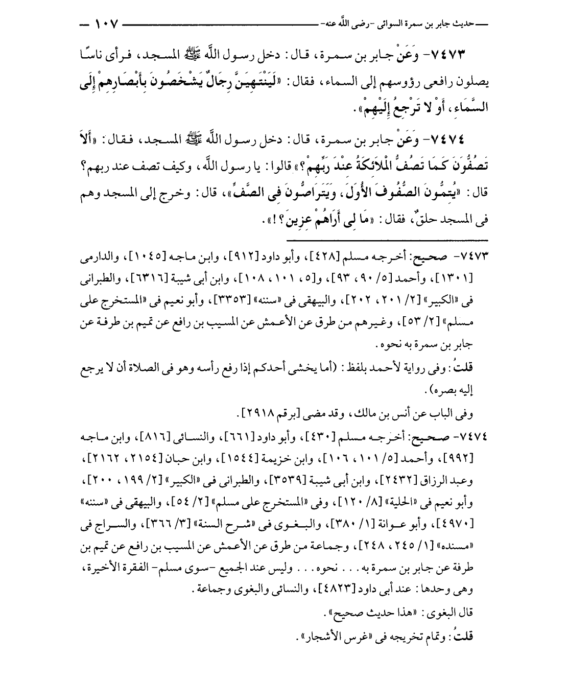 ٧٤٧٤ - صحيح: أخرجه مسلم [٤٣٠]، وأبو داود [٦٦١]، والنسائي [٨١٦]، وابن ماجه [٩٩٢]، وأحمد [٥/ ١٠١، ١٠٦]، وابن خزيمة [١٥٤٤]، وابن حبان [٢١٥٤، ٢١٦٢]، وعبد الرزاق [٢٤٣٢]، وابن أبي شيبة [٣٥٣٩]، والطبراني في "الكبير" [٢/ ١٩٩، ٢٠٠]، وأبو نعيم في "الحلية" [٨/ ١٢٠]، وفي "المستخرج على مسلم" [٢/ ٥٤]، والبيهقي في "سننه" [٤٩٧٠]، وأبو عوانة [١/ ٣٨٠]، والبغوي في "شرح السنة" [٣/ ٣٦٦]، والسراج في "مسنده" [١/ ٢٤٥، ٢٤٨]، وجماعة من طرق عن الأعمش عن المسيب بن رافع عن تميم بن طرفة عن جابر بن سمرة به ... نحوه ... وليس عند الجميع - سوى مسلم - الفقرة الأخيرة، وهى وحدها: عند أبي داود [٤٨٢٣]، والنسائي والبغوي وجماعة.