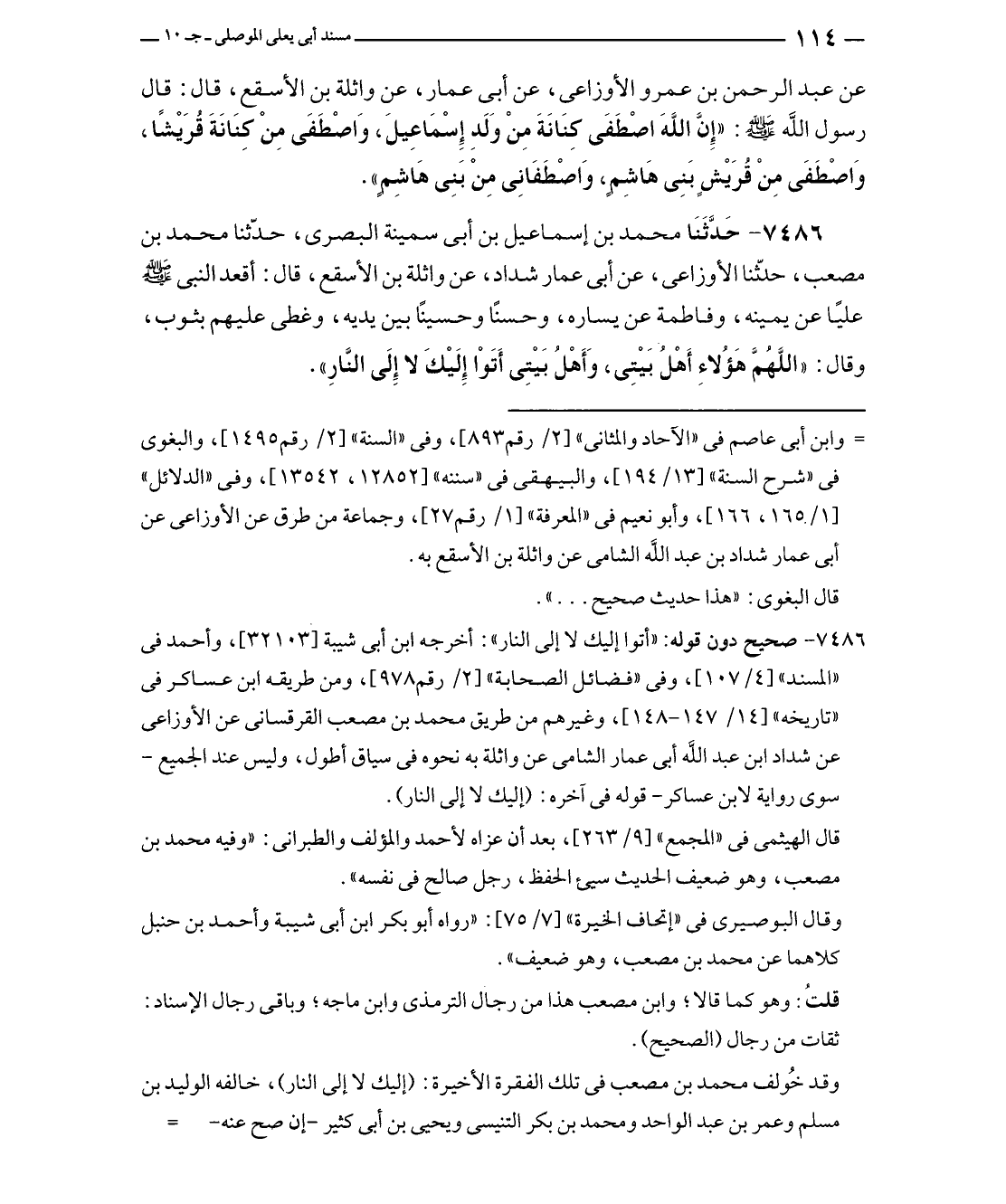 ٧٤٨٦ - حَدَّثَنَا محمد بن إسماعيل بن أبى سمينة البصرى، حدّثنا محمد بن مصعب، حدثّنا الأوزاعى، عن أبى عمار شداد، عن واثلة بن الأسقع، قال: أقعد النبي - صلى الله عليه وسلم - عليًا عن يمينه، وفاطمة عن يساره، وحسنًا وحسينًا بين يديه، وغطى عليهم بثوب، وقال: "اللَّهُمَّ هَؤُلاءِ أَهْلُ بَيْتِى، وَأَهْلُ بَيْتِى أَتَوْا إلَيْكَ لا إلَى النَّارِ".