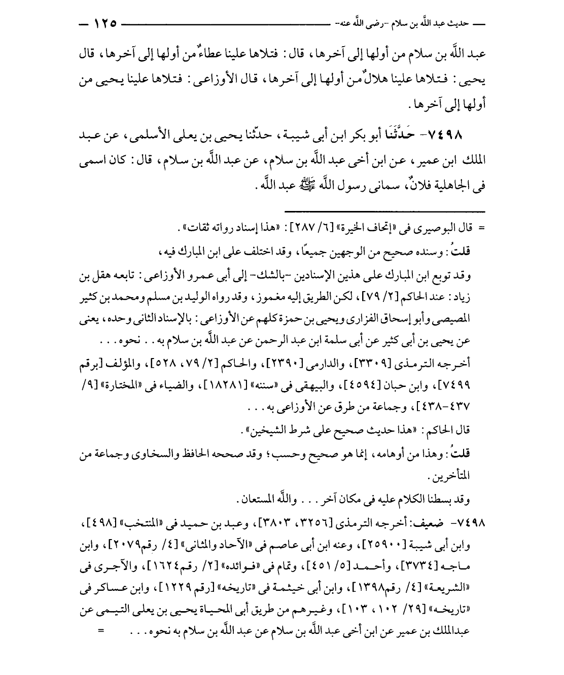 ٧٤٩٨ - حَدَّثَنَا أبو بكر بن أبى شيبة، حدّثنا يحيى بن يعلى الأسلمى، عن عبد الملك بن عمير، عن ابن أخى عبد الله بن سلام، عن عبد الله بن سلام، قال: كان اسمى في الجاهلية فلان، سمانى رسول الله - صلى الله عليه وسلم - عبد الله.