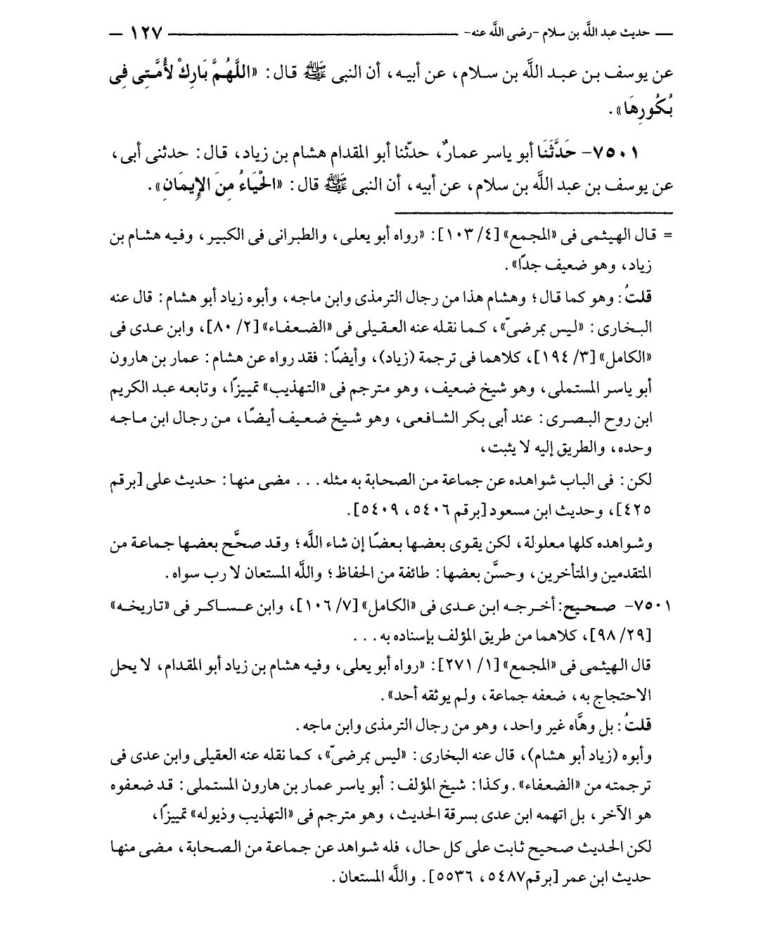 ٧٥٠١ - حَدَّثَنَا أبو ياسر عمارٌ، حدّثنا أبو المقدام هشام بن زياد، قال: حدثنى أبى، عن يوسف بن عبد الله بن سلام، عن أبيه، أن النبي - صلى الله عليه وسلم - قال: "الحيَاءُ مِنَ الإِيمَانِ".