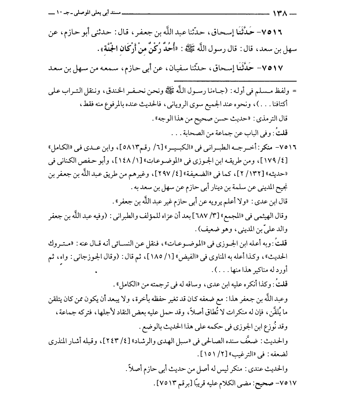 ٧٥١٦ - حَدَّثَنَا إسحاق، حدّثنا عبد الله بن جعفر، قال: حدثنى أبو حازم، عن سهل بن سعد، قال: قال رسول - صلى الله عليه وسلم -: "أُحُدٌ رُكْنٌ مِنْ أَرْكَانِ الجَنَّةِ".