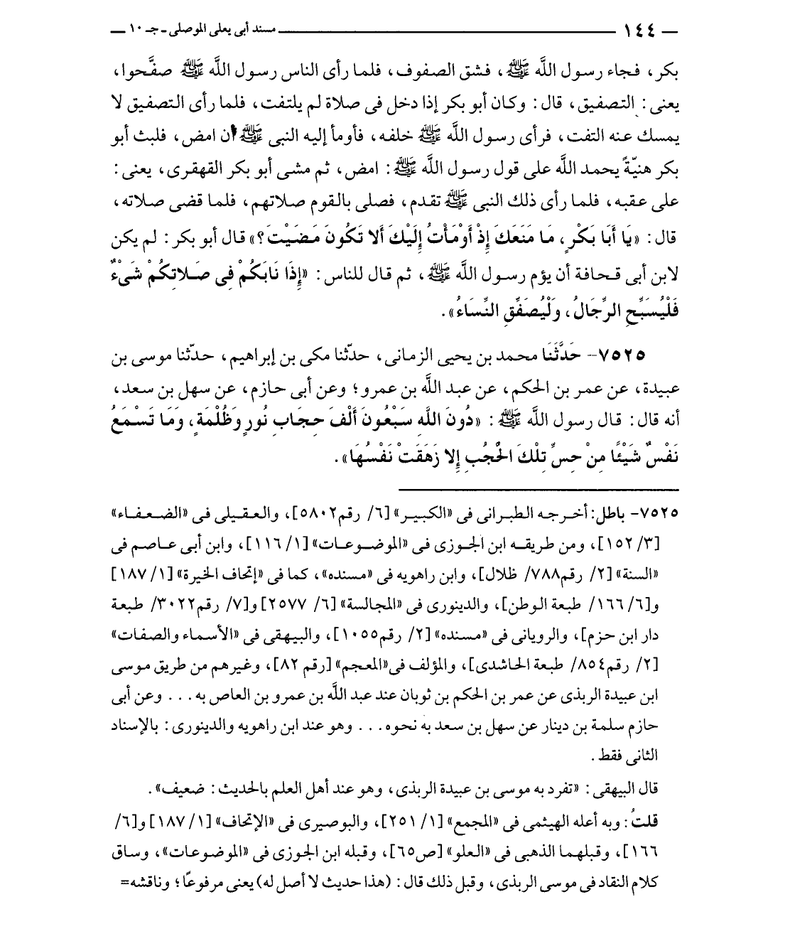 ٧٥٢٥ - حَدَّثَنَا محمد بن يحيى الزمانى، حدّثنا مكى بن إبراهيم، حدّثنا موسى بن عبيدة، عن عمر بن الحكم، عن عبد الله بن عمرو؛ وعن أبى حازم، عن سهل بن سعد، أنه قال: قال رسول الله - صلى الله عليه وسلم -: "دُونَ اللَّهِ سبْعُونَ أَلْفَ حِجَابِ نُورٍ وَظُلْمَةٍ، وَمَا تَسْمَعُ نَفْسٌ شَيْئًا مِنْ حِسِّ تِلْكَ الحُجُبِ إلا زَهَقَتْ نَفْسُهَا".