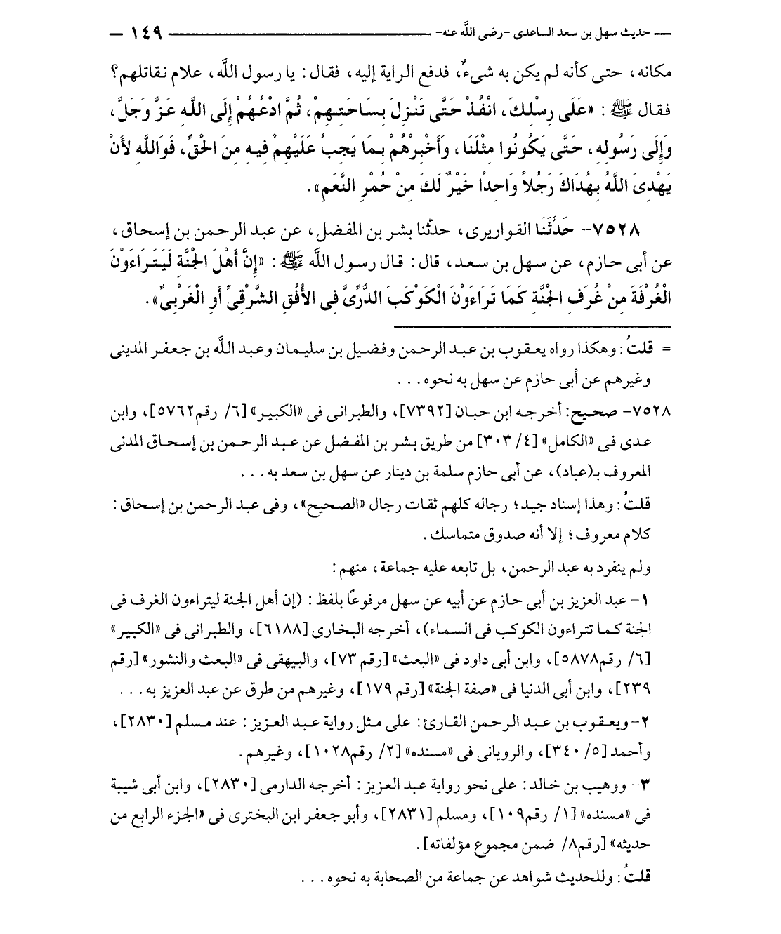 ٧٥٢٨ - حَدَّثَنَا القواريرى، حدّثنا بشر بن المفضل، عن عبد الرحمن بن إسحاق، عن أبى حازم، عن سهل بن سعد، قال: قال رسول الله - صلى الله عليه وسلم -: "إنَّ أَهْلَ الجَنَّةِ لَيَتَرَاءَوْنَ الْغُرْفَةَ مِنْ غُرَفِ الجَنَّةِ كَمَا تَرَاءَوْنَ الْكَوْكَبَ الدُّرِّيَّ فِي الأُفُقِ الشَّرْقِيِّ أَوِ الْغَرْبِيِّ".