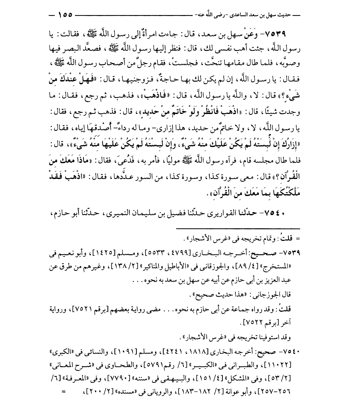 ٧٥٣٩ - وَعَنْ سهل بن سعد، قال: جاءت امرأةٌ إلى رسول الله - صلى الله عليه وسلم -، فقالت: يا رسول الله، جئت أهب نفسى لك، قال: فنظر إليها رسول الله - صلى الله عليه وسلم -، فصعَّد البصر فيها وصوَّبه، فلما طال مقامها تنحَّت، فجلستْ، فقام رجلٌ من أصحاب رسول الله - صلى الله عليه وسلم -، فقال: يا رسول الله، إن لم يكن لك بها حاجةٌ، فزوجنيها، قال: "فَهَلْ عِنْدَكَ مِنْ شَىْءٍ؟ " قال: لا، واللَّه يا رسول الله، قال: "فَاذْهَبْ"، فذهب، ثم رجع، فقال: ما وجدت شيئًا، قال: "اذْهَبْ فَانْظُرْ وَلَوْ خَاتَمٌ مِنْ حَدِيدٍ"، قال: فذهب ثم رجع، فقال: يا رسول الله، لا، ولا خاتم من حديد، هذا إزارى - وما له رداءٌ أُصْدِقِهَا إياه، فقال: "إزَارُكَ إن لَبِسَتْهُ لَمْ يَكُنْ عَلَيْكَ مِنْهُ شَىْءٌ، وَإنْ لَبِسْتَهُ لَمْ يَكُنْ عَلَيْهَا مِنْهُ شَىْءٌ"، قال: فلما طال مجلسه قام، فرآه رسول الله - صلى الله عليه وسلم - موليًا، فأمر به، فَدُعِىَ، فقال: "مَاذَا مَعَكَ مِنَ الْقُرْآنِ؟ "قال: معى سورة كذا، وسورة كذا، من السور عدَّدها، فقال: "اذْهَبْ فَقَدْ مَلَّكْتُكَهَا بِمَا مَعَكَ مِنَ الْقُرآنِ".