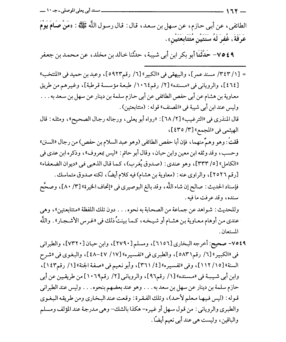 الطائفى، عن أبى حازم، عن سهل بن سعد، قال: قال رسول الله - صلى الله عليه وسلم -: "مَنْ صَامَ يَوْمَ عَرَفَةَ، غُفِرَ لَهُ سَنَتَيْنِ مُتَتَابِعَتَيْنِ".