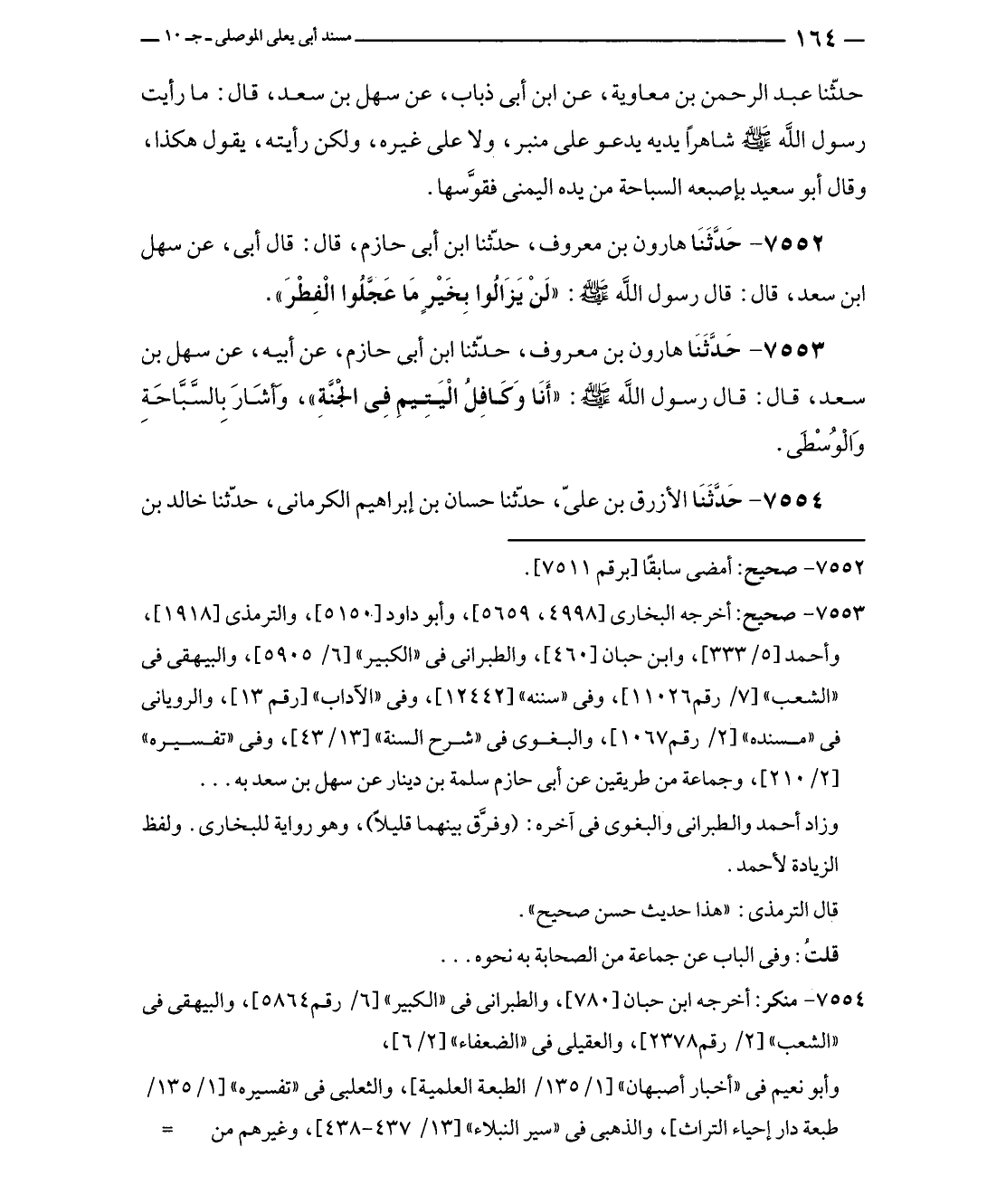 ٧٥٥٣ - حَدَّثَنَا هارون بن معروف، حدّثنا ابن أبى حازم، عن أبيه، عن سهل بن سعد، قال: قال رسول الله - صلى الله عليه وسلم -: "أَنَا وَكَافِلُ الْيَتِيمِ فِي الجَنَّةِ"، وَأشَارَ بِالسَّبَّاحَةِ وَالْوُسْطَى.