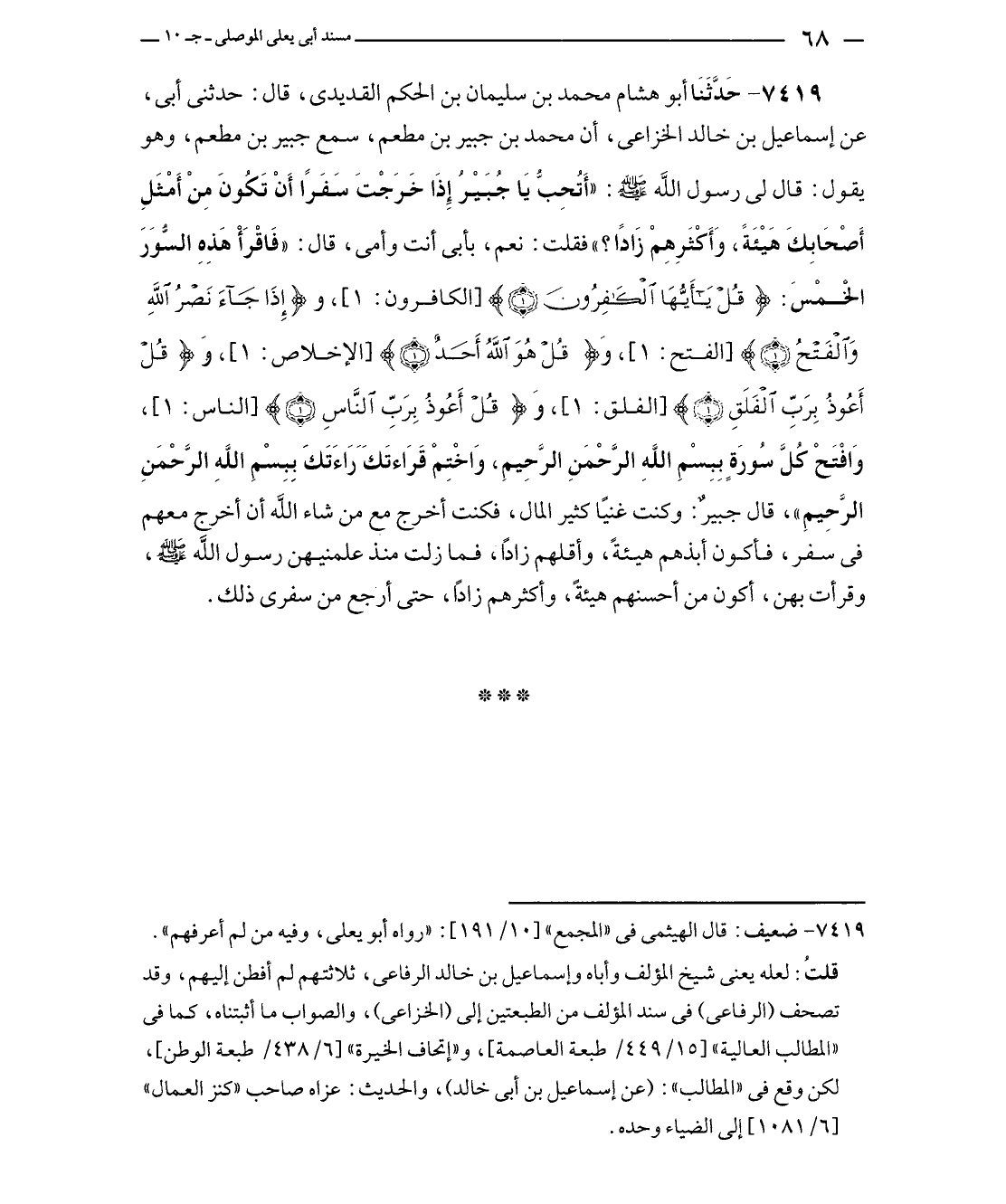 ٧٤١٩ - حَدَّثَنَا أبو هشام محمد بن سليمان بن الحكم القديدي، قال: حدثني أبي، عن إسماعيل بن خالد الخزاعي، أن محمد بن جبير بن مطعم، سمع جبير بن مطعم، وهو يقول: قال لي رسول الله - صلى الله عليه وسلم -: "أَتُحِبُّ يَا جُبَيْرُ إِذَا خَرَجْتَ سَفَرًا أَنْ تَكُونَ مِنْ أَمْثَلِ أَصْحَابِكَ هَيْئَةً، وَأَكثَرِهِمْ زَادًا؟ " فقلت: نعم، بأبى أنت وأمى، قال: "فَاقْرَأْ هَذِهِ السُّوَرَ الخمْسَ: {قُلْ يَاأَيُّهَا الْكَافِرُونَ (١)} [الكافرون: ١]، و {إِذَا جَاءَ نَصْرُ اللَّهِ وَالْفَتْحُ (١)} [النصر: ١] وَ {قُلْ هُوَ اللَّهُ أَحَدٌ (١)} [الإخلاص: ١]، و {قُلْ أَعُوذُ بِرَبِّ الْفَلَقِ (١)} [الفلق: ١]، وَ {قُلْ أَعُوذُ بِرَبِّ النَّاسِ (١)} [الناس: ١]، وَافْتَحْ كلَّ سورَةٍ بِبِسْمِ اللَّهِ الرَّحْمَنِ الرَّحِيمِ، وَاخْتِمْ قَرَاءتَكَ رَاءَتَكَ بِبِسْمِ اللَّهِ الرَّحْمَنِ الرَّحِيمِ"، قال جبيرٌ: وكنت غنيًا كثير المال، فكنت أخرج مع من شاء الله أن أخرج معهم في سفر، فأكون أبذهم هيئةً، وأقلهم زادًا، فما زلت منذ علمنيهن رسول الله - صلى الله عليه وسلم -، وقرأت بهن، أكون من أحسنهم هيئةً، وأكثرهم زادًا، حتى أرجع من سفرى ذلك.