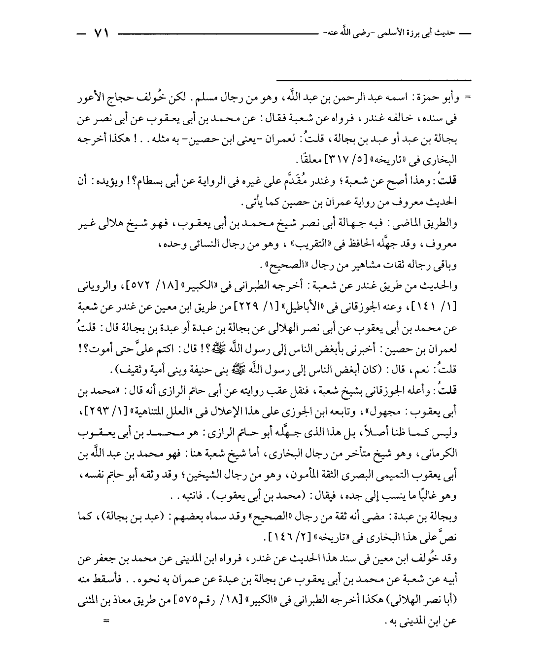 وقد خُولف ابن معين في سند هذا الحديث عن غندر، فرواه ابن المديني عن محمد بن جعفر عن أبيه عن شعبة عن محمد بن أبي يعقوب عن بجالة بن عبدة عن عمران به نحوه .. فأسقط منه (أبا نصر الهلالى) هكذا أخرجه الطبراني في "الكبير" [١٨/ رقم ٥٧٥] من طريق معاذ بن المثني عن ابن المديني به. =