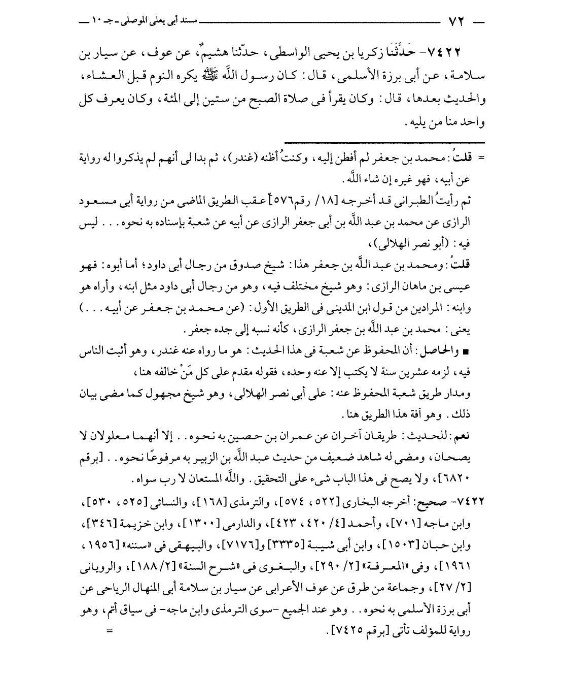 ٧٤٢٢ - صحيح: أخرجه البخاري [٥٢٢، ٥٧٤]، والترمذي [١٦٨]، والنسائي [٥٢٥، ٥٣٠]، وابن ماجه [٧٠١]، وأحمد [٤/ ٤٢٠، ٤٢٣]، والدارمي [١٣٠٠]، وابن خزيمة [٣٤٦]، وابن حبان [١٥٠٣]، وابن أبي شيبة [٣٣٣٥] و [٧١٧٦]، والبيهقي في "سننه" [١٩٥٦، ١٩٦١]، وفي "المعرفة" [٢/ ٢٩٠]، والبغوي في "شرح السنة" [٢/ ١٨٨]، والروياني [٢/ ٢٧]، وجماعة من طرق عن عوف الأعرابى عن سيار بن سلامة أبي المنهال الرياحي عن أبي برزة الأسلمي به نحوه .. وهو عند الجميع - سوى الترمذي وابن ماجه - في سياق أتم، وهو رواية للمؤلف تأتى [برقم ٧٤٢٥]. =