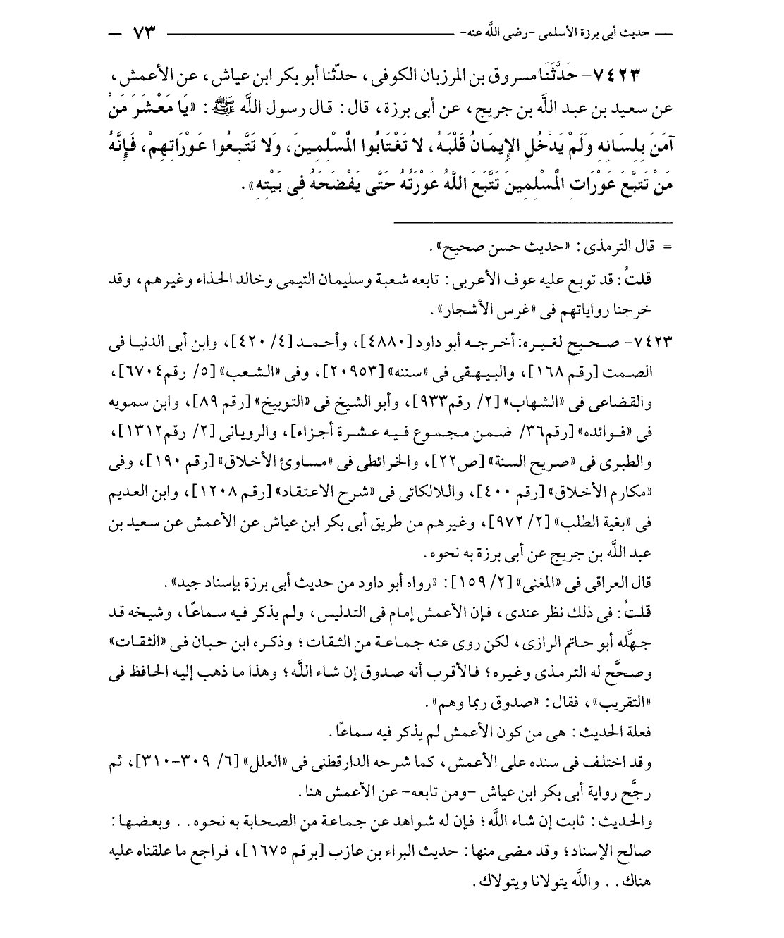 ٧٤٢٣ - حَدَّثَنَا مسروق بن المرزبان الكوفي، حدّثنا أبو بكر بن عياش، عن الأعمشِ، عن سعيد بن عبد الله بن جريج، عن أبي برزة، قال: قال رسول الله - صلى الله عليه وسلم -: "يَا مَعْشَرَ منْ آمَنَ بِلِسَانِهِ وَلَمْ يَدْخُلِ إلإِيمَانُ قَلْبَهُ، لا تَغْتَابُوا الْمُسْلِمِينَ، وَلا تَتَّبِعُوا عَوْرَاتِهِمْ، فَإِنَّهُ مَنْ تَتبَّعَ عَوْرَاتِ الْمُسْلِمِينَ تَتَّبَعَ اللَّهُ عوْرَتُهُ حَتَّى يَفْضَحَهُ فِي بَيْتِهِ".