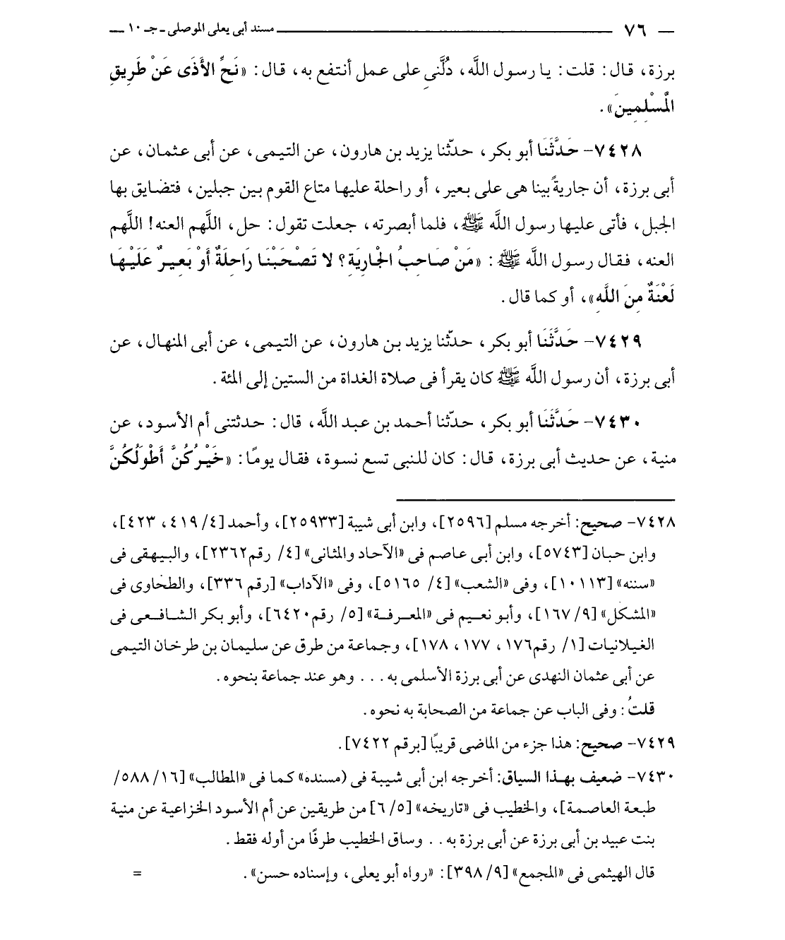 ٧٤٢٨ - صحيح: أخرجه مسلم [٢٥٩٦]، وابن أبي شيبة [٢٥٩٣٣]، وأحمد [٤/ ٤١٩، ٤٢٣]، وابن حبان [٥٧٤٣]، وابن أبي عاصم في "الآحاد والمثاني" [٤/ رقم ٢٣٦٢]، والبيهقي في "سننه" [١٠١١٣]، وفي "الشعب" [٤/ ٥١٦٥]، وفي "الآداب" [رقم ٣٣٦]، والطخاوي في "المشكل" [٩/ ١٦٧]، وأبو نعيم في "المعرفة" [٥/ رقم ٦٤٢٠]، وأبو بكر الشافعي في الغيلانيات [١/ رقم ١٧٦، ١٧٧، ١٧٨]، وجماعة من طرق عن سليمان بن طرخان التيمي عن أبي عثمان النهدي عن أبي برزة الأسلمي به ... وهو عند جماعة بنحوه.