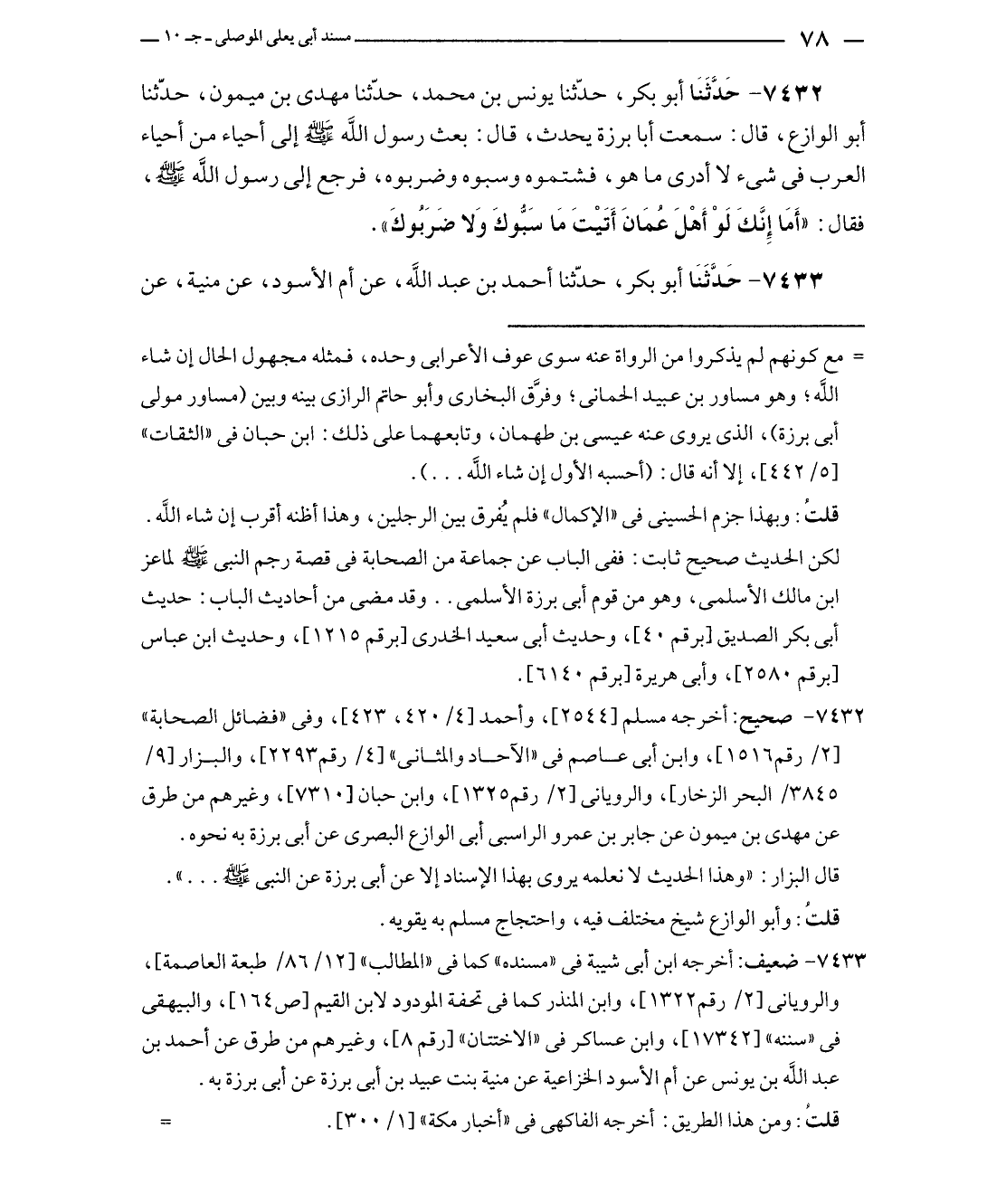 ٧٤٣٢ - صحيح: أخرجه مسلم [٢٥٤٤]، وأحمد [٤/ ٤٢٠، ٤٢٣]، وفي "فضائل الصحابة" [٢/ رقم ١٥١٦]، وابن أبي عاصم في "الآحاد والمثاني" [٤/ رقم ٢٢٩٣]، والبزار [٩/ ٣٨٤٥/ البحر الزخار]، والروياني [٢/ رقم ١٣٢٥]، وابن حبان [٧٣١٠]، وغيرهم من طرق عن مهدى بن ميمون عن جابر بن عمرو الراسبى أبي الوازع البصري عن أبي برزة به نحوه.